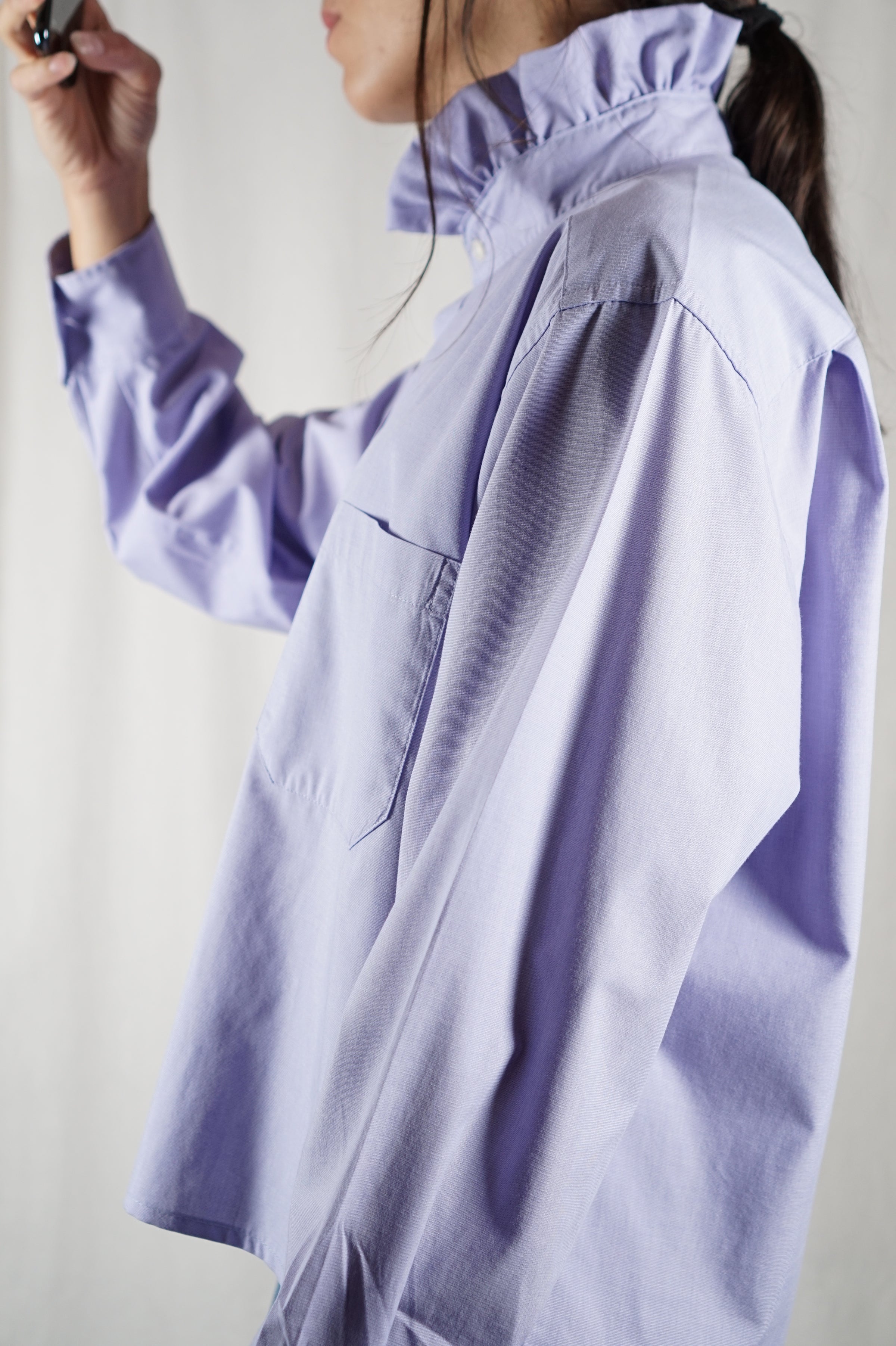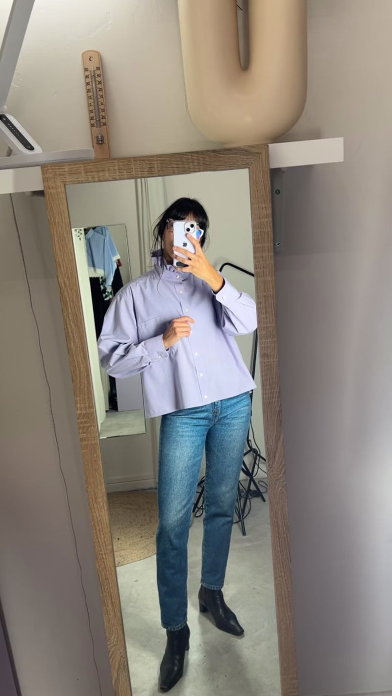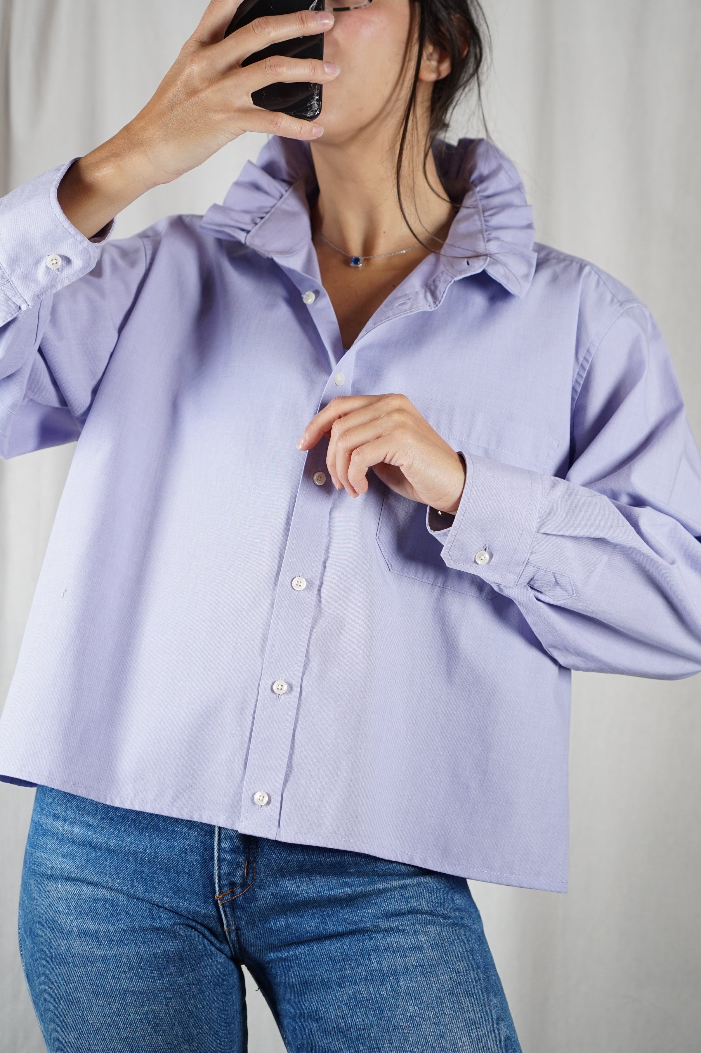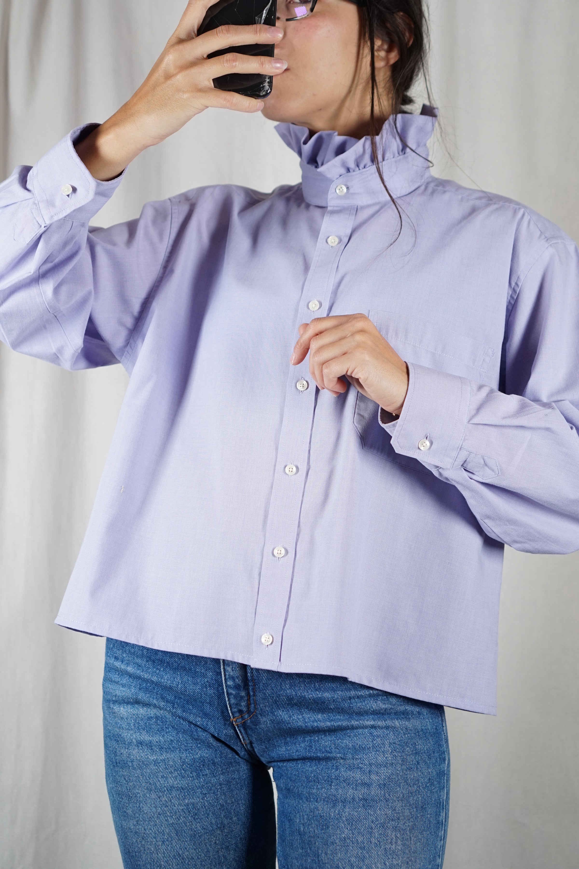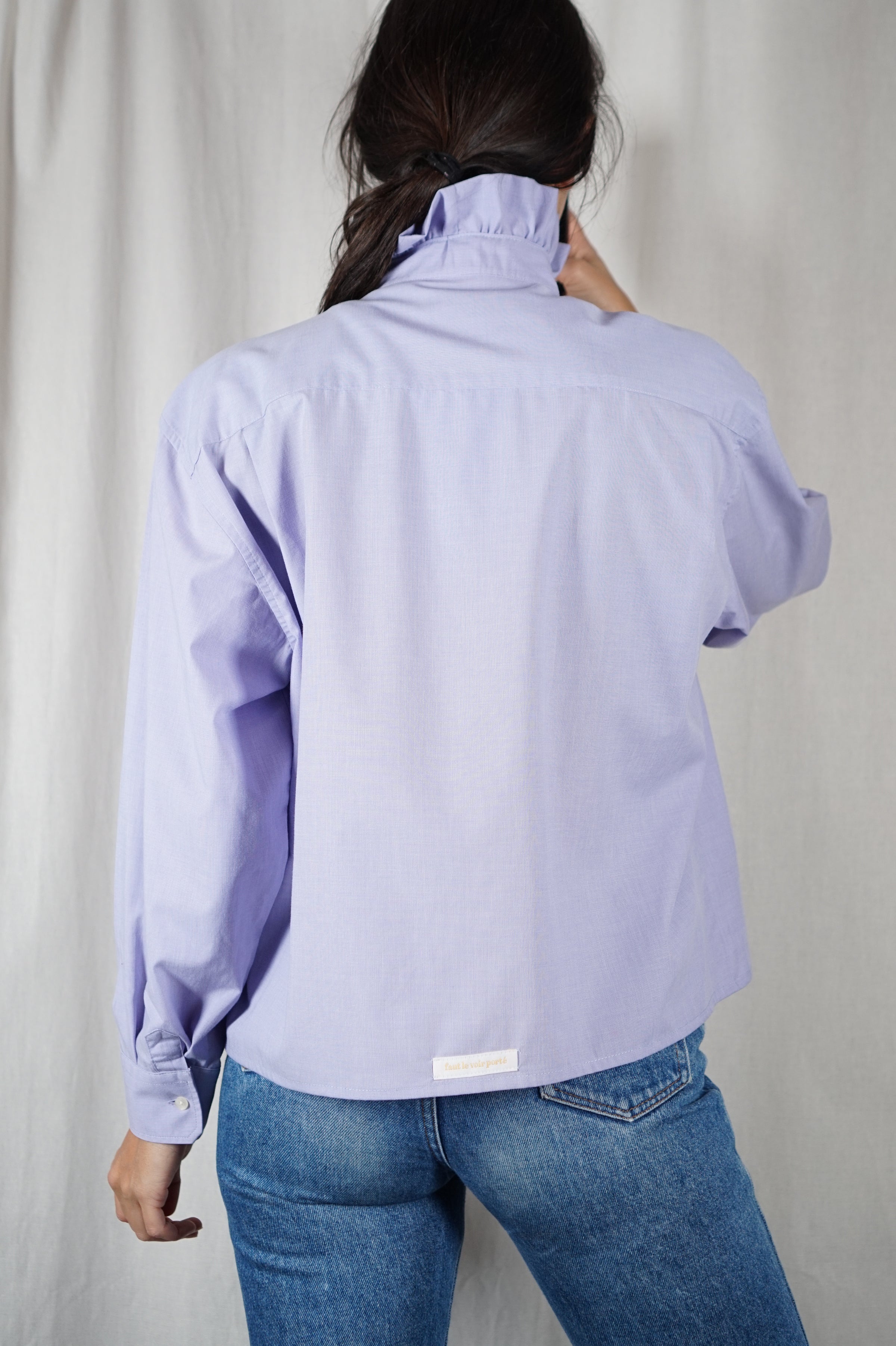 Description : Superbe Chemise Collerette Lila en coton (et peut-être un peu de polyester, la matière est superbe) retravaillée par mes soins - belle pièce - je suis venue raccourcir la chemise afin de recréer une coupe légèrement trapèze, reprendre les manches en remontant le poignet pour les raccourcir légèrement (il s'agit à l'origine d'une chemise pour homme, les manches étaient donc plus longues) - j'ai décousu le col et cousu un col froncé que j'ai confectionné avec le bas de chemise pour créer cet effet collerette . La matière et la couleur sont superbes, belle qualité et agréable à porter.