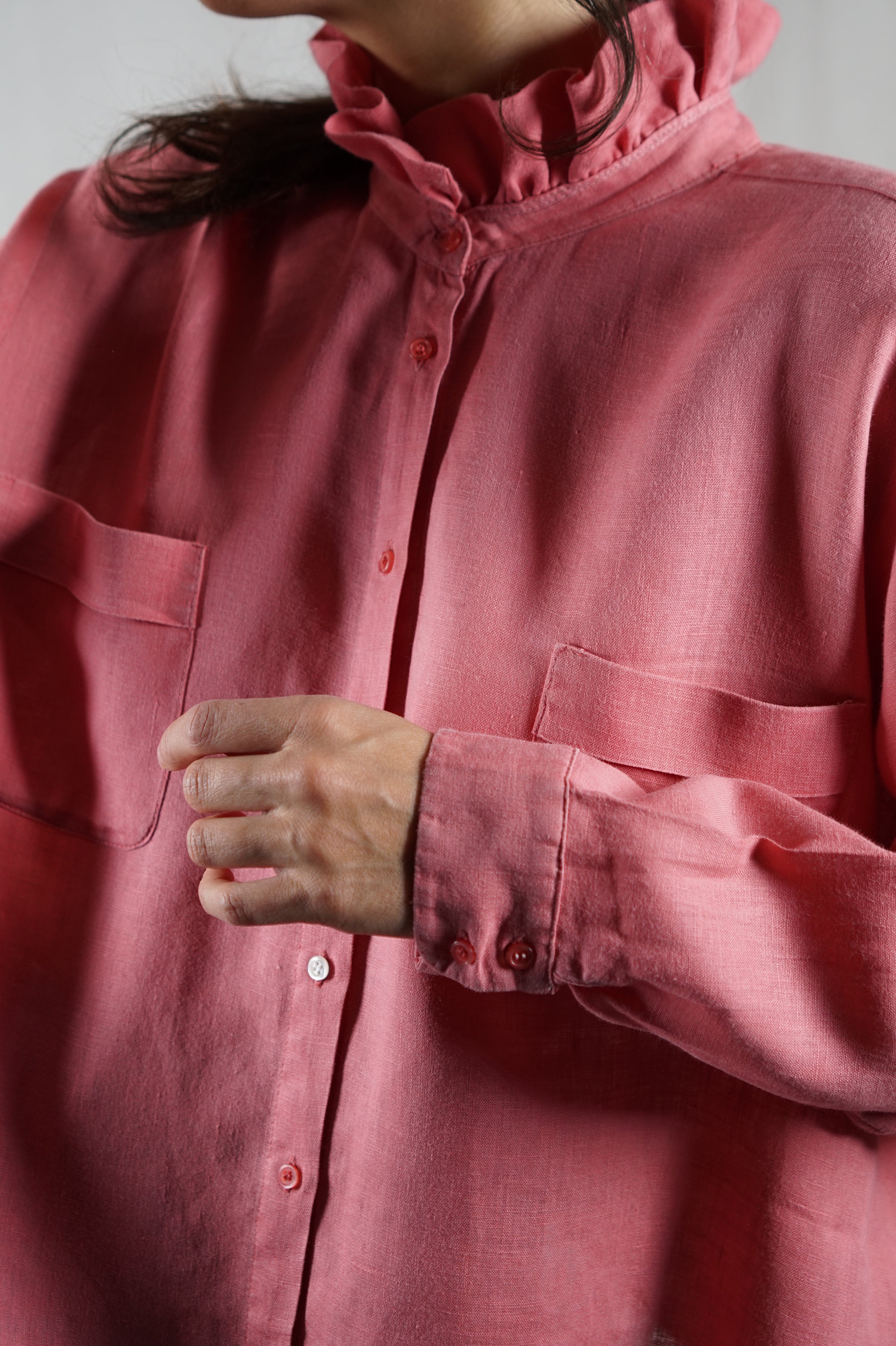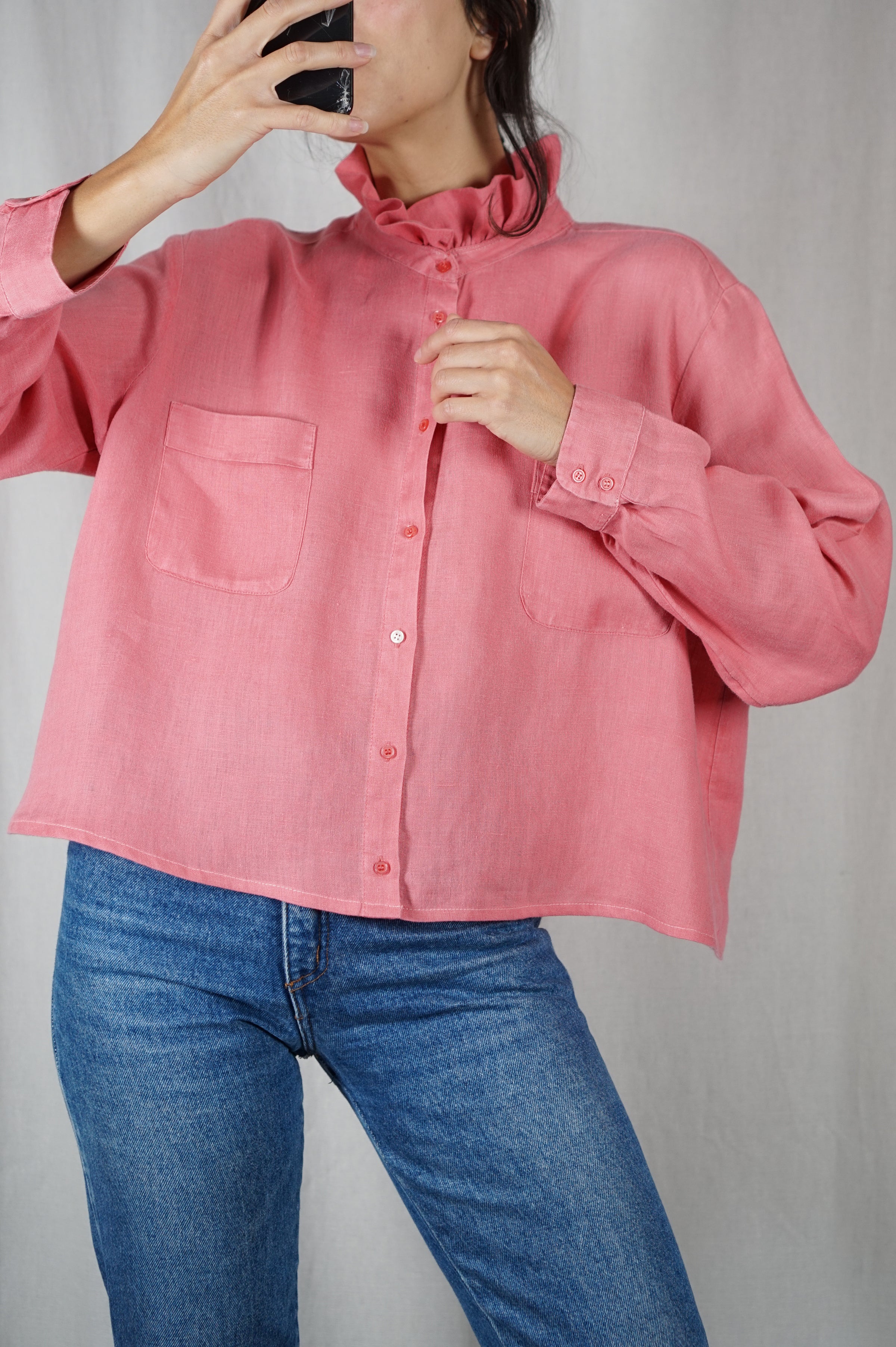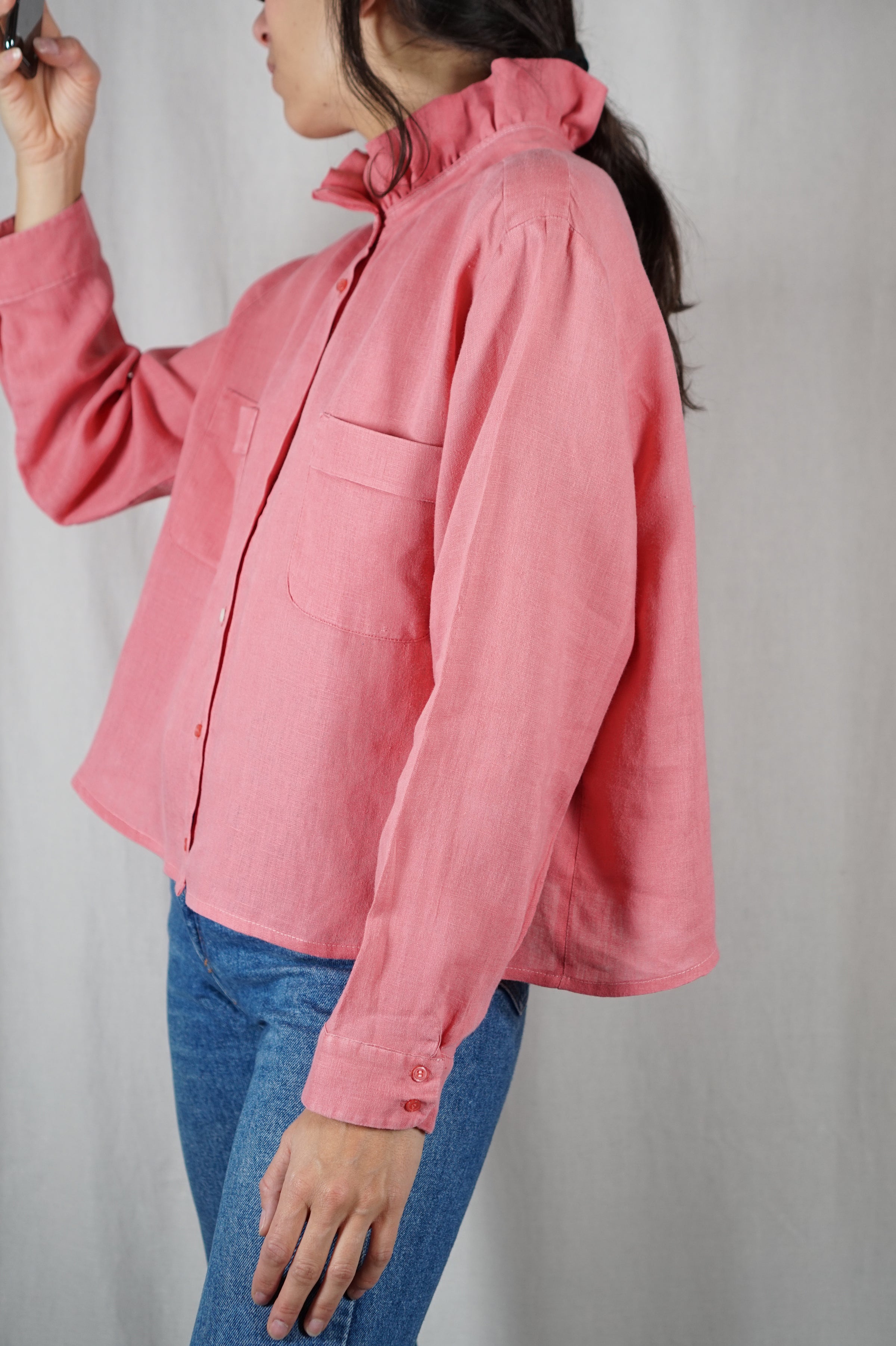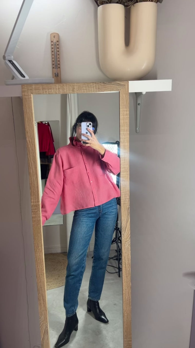 Description : Superbe Chemise Collerette couleur rose chiné en lin, cette couleur et matière sont des coups de coeur, retravaillée par mes soins - Très agréable à porter - je suis venue raccourcir la chemise afin de recréer une coupe légèrement trapèze, reprendre les manches en remontant le poignet pour raccourcir légèrement les manches - j'ai décousu le col et cousu un col froncé que j'ai confectionné avec le bas de chemise pour créer cet effet collerette - La matière et la couleur sont superbes, belle qualité et agréable à porter.
