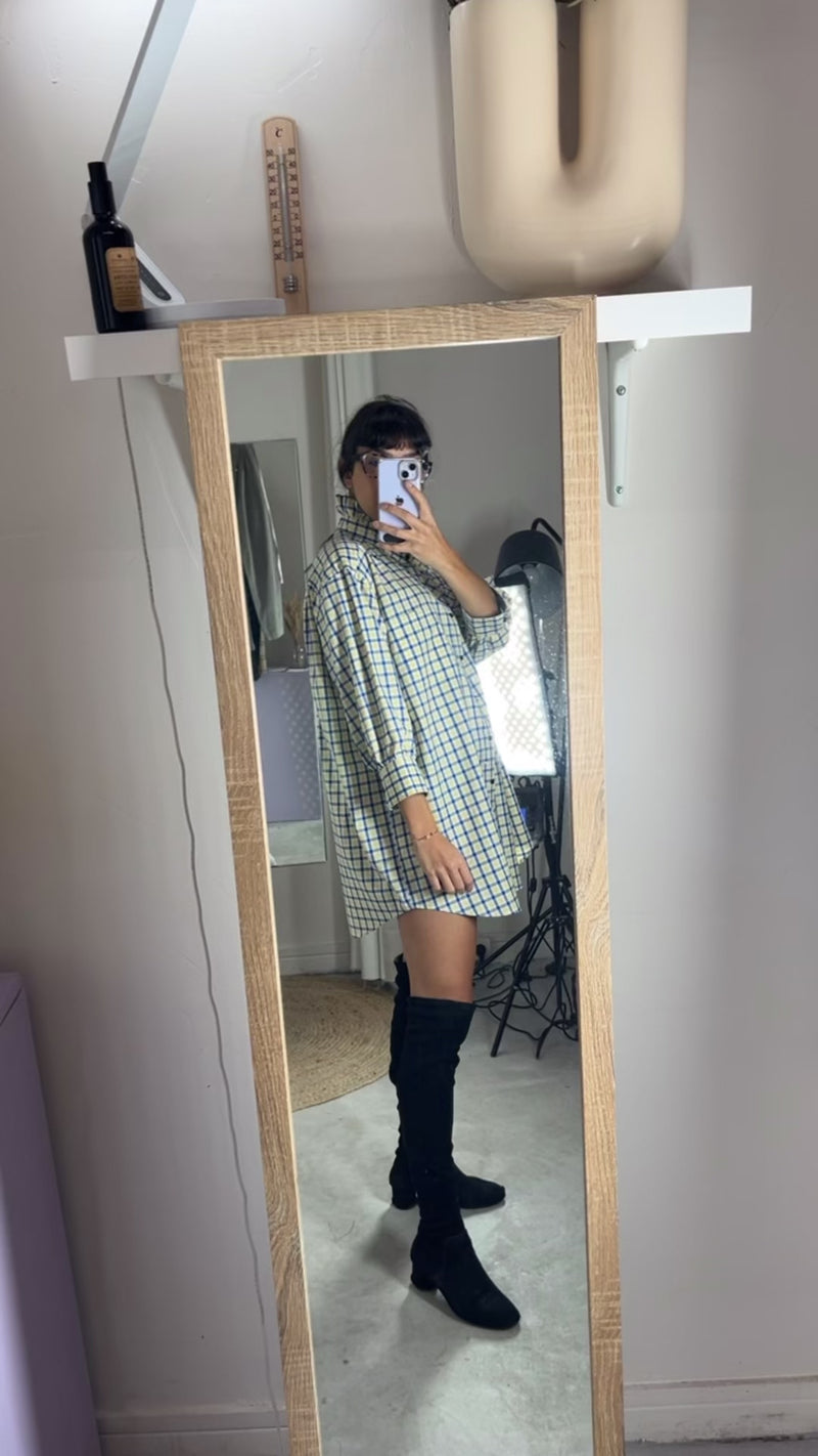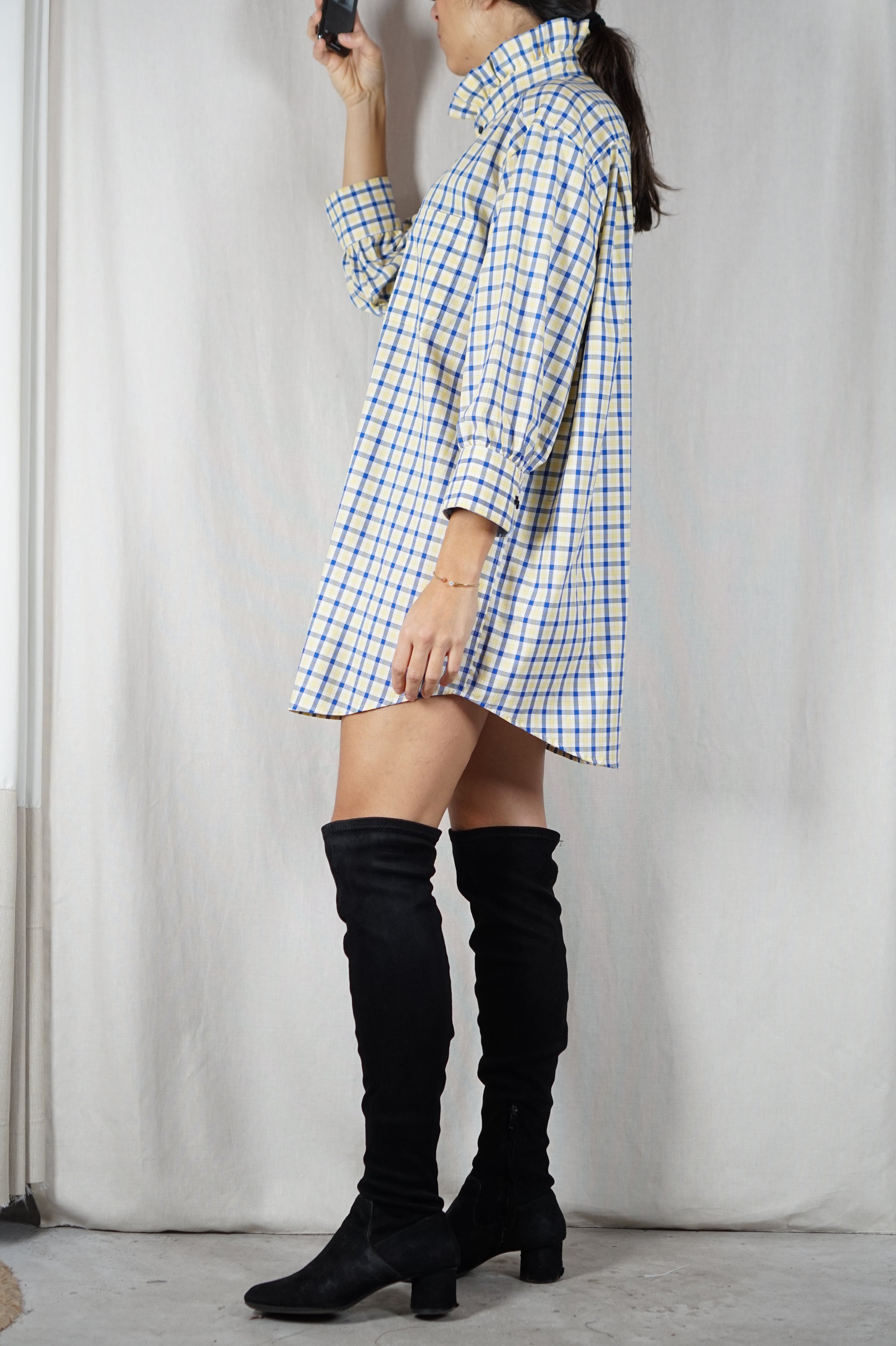 Cette Robe Collerette à carreaux de faut le voir porté est une pièce unique confectionnée à partir d'une belle Chemise Vintage pour Homme extra-large 100% coton opaque. La matière est très agréable à porter. Très belle qualité de la chemise initiale