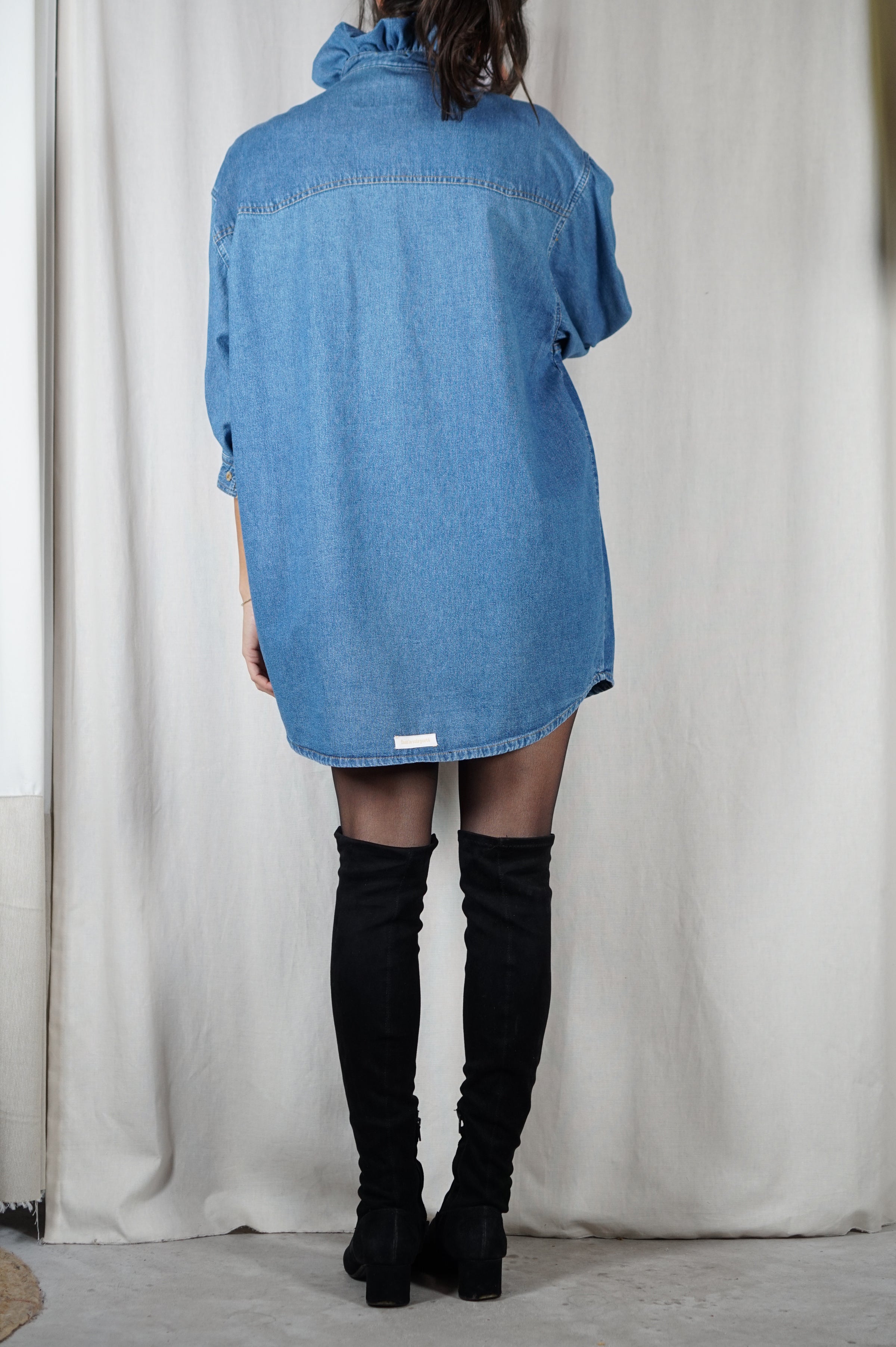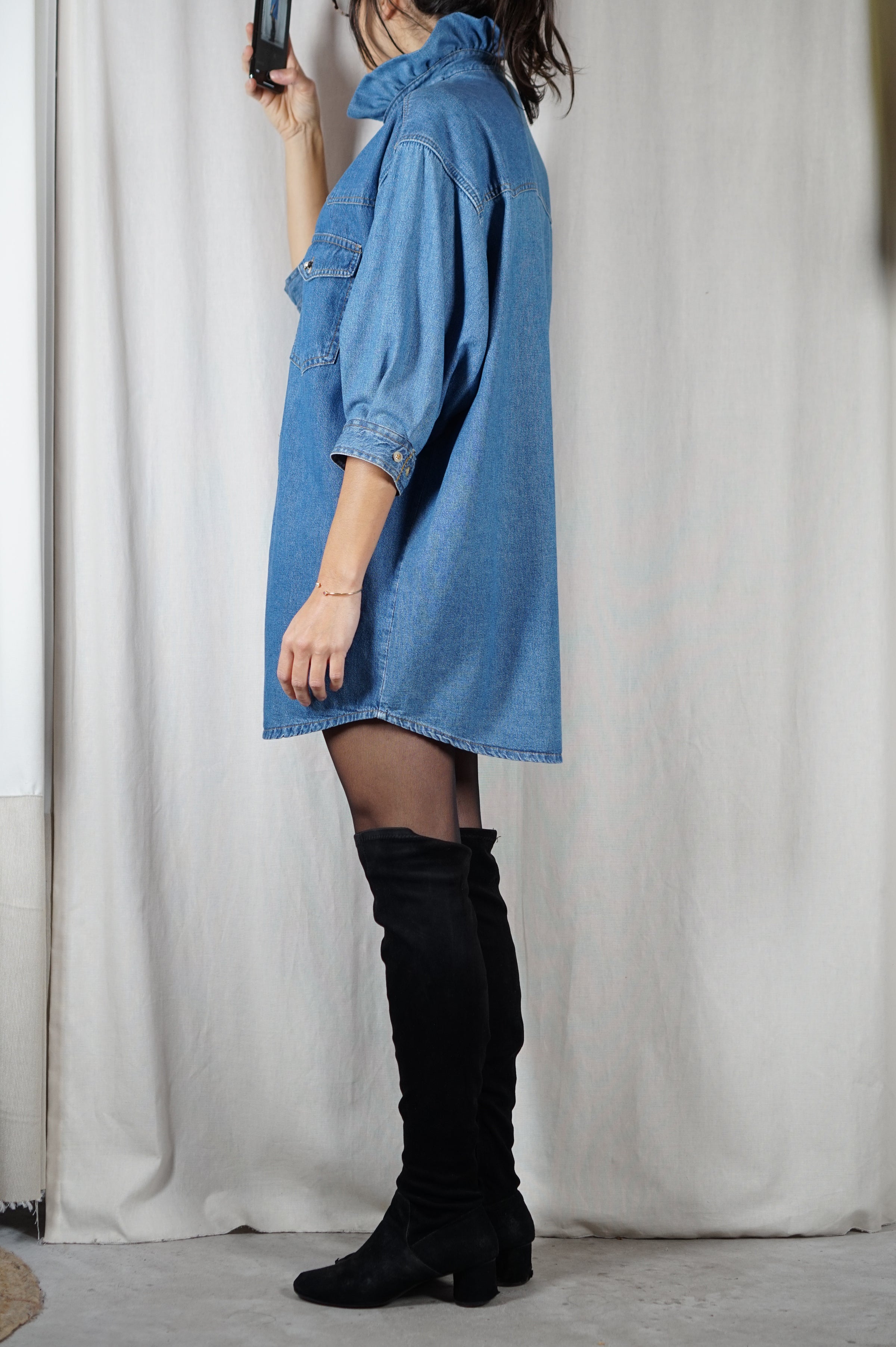 Cette Robe Collerette en Denim de faut le voir porté est une pièce unique confectionnée à partir d'une Chemise Vintage épaisse pour Homme large en Denim coton opaque. La matière est très agréable à porter. Belle qualité de la chemise initiale