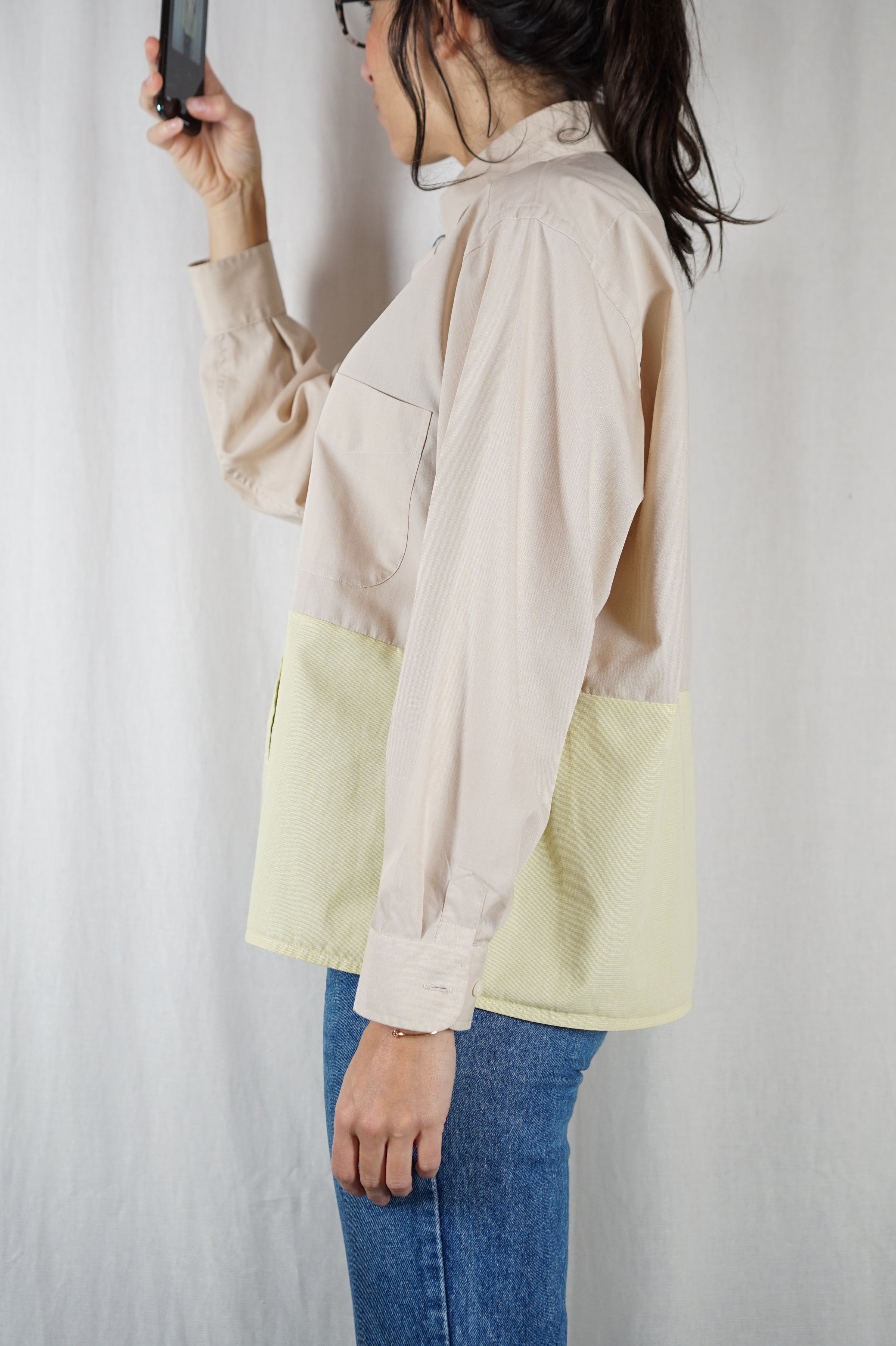 Cette Chemise Sable & Jaune sable de faut le voir porté est une pièce unique confectionnée à partir de deux chemises de belles qualités en coton mélangé et en excellent état - Les couleurs et la qualité sont magnifiques et s'accordent très bien!