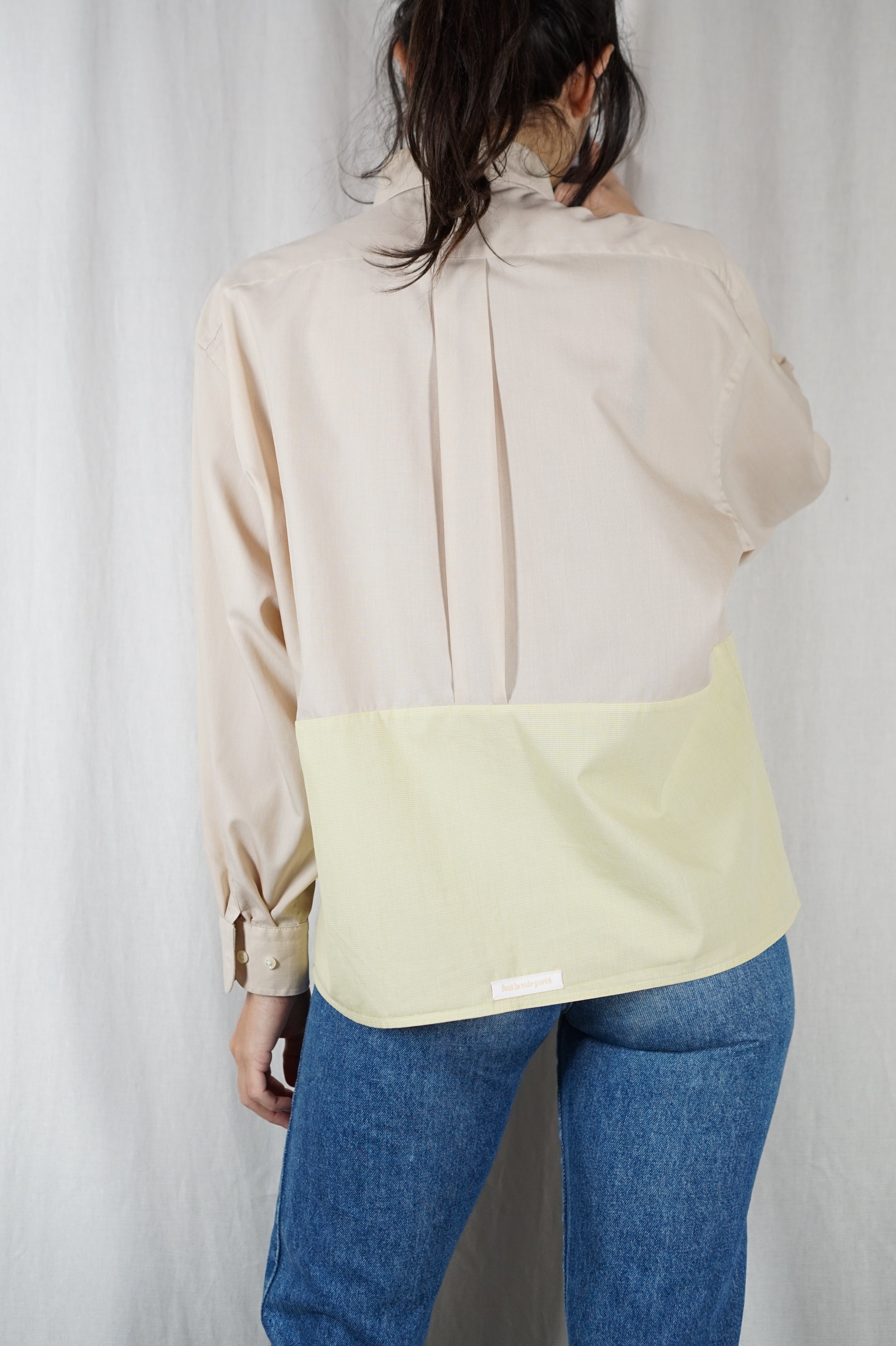Précision : les chemises utilisées pour upcycler les chemises sorbet sont des pièces pour homme. Elles sont en coton et contiennent parfois un petit peu de polyester pour un aspect moins "rigide" et un plus joli tombé mais également pour un meilleur entretien. Le confort n'en est pas moindre. Aussi, le col peut être légèrement plus rigide que des cols de chemise pour femme.