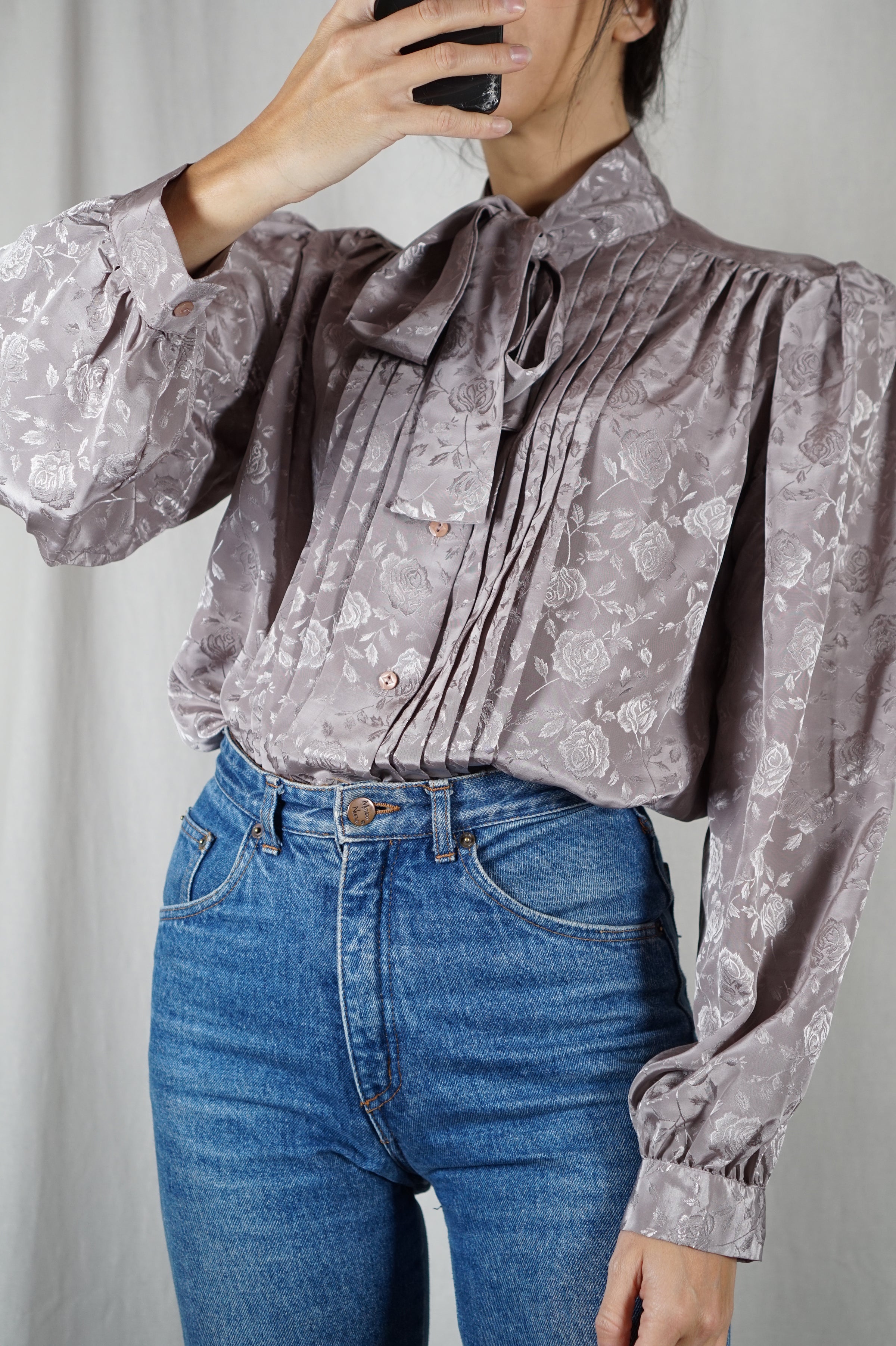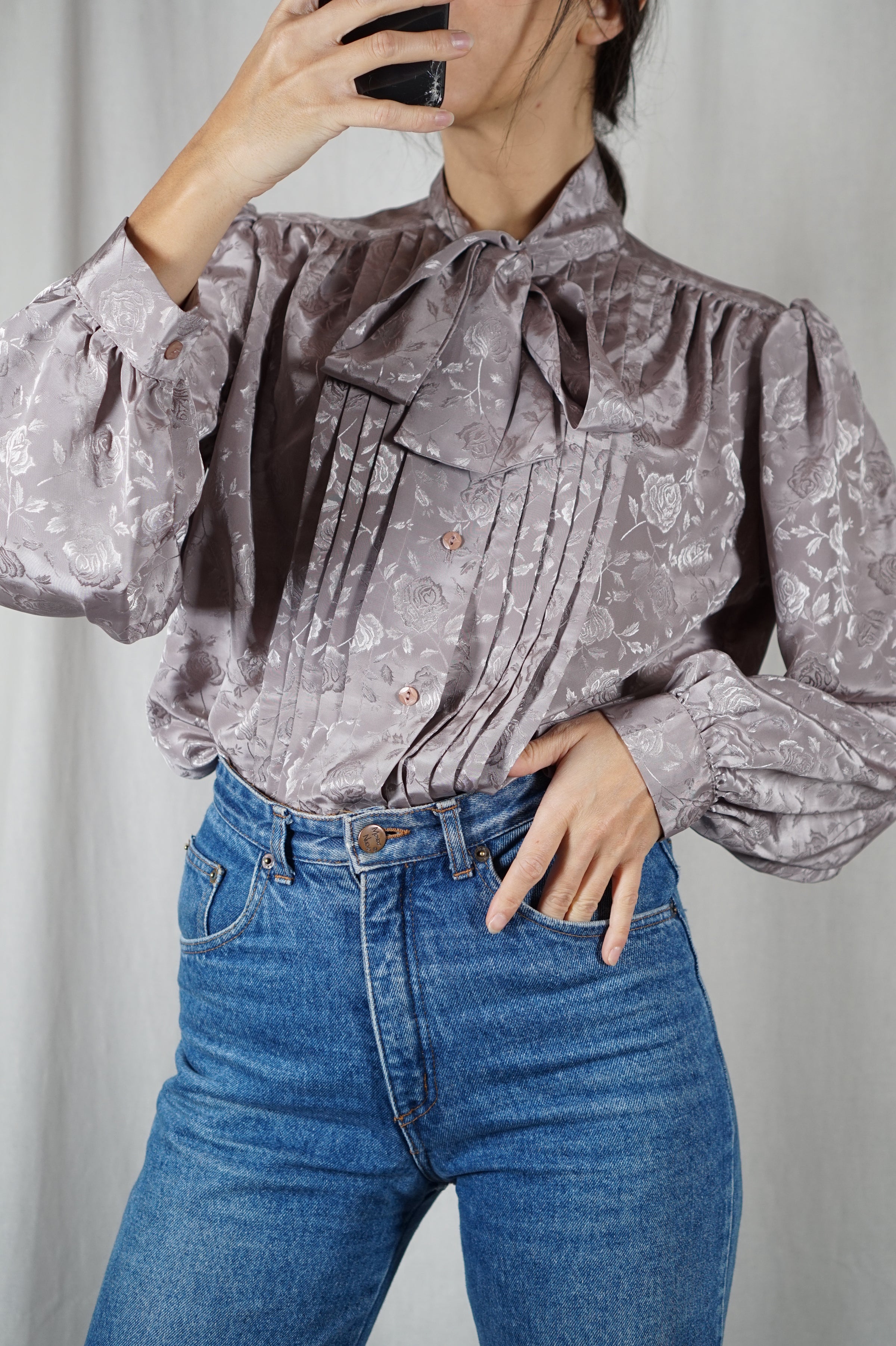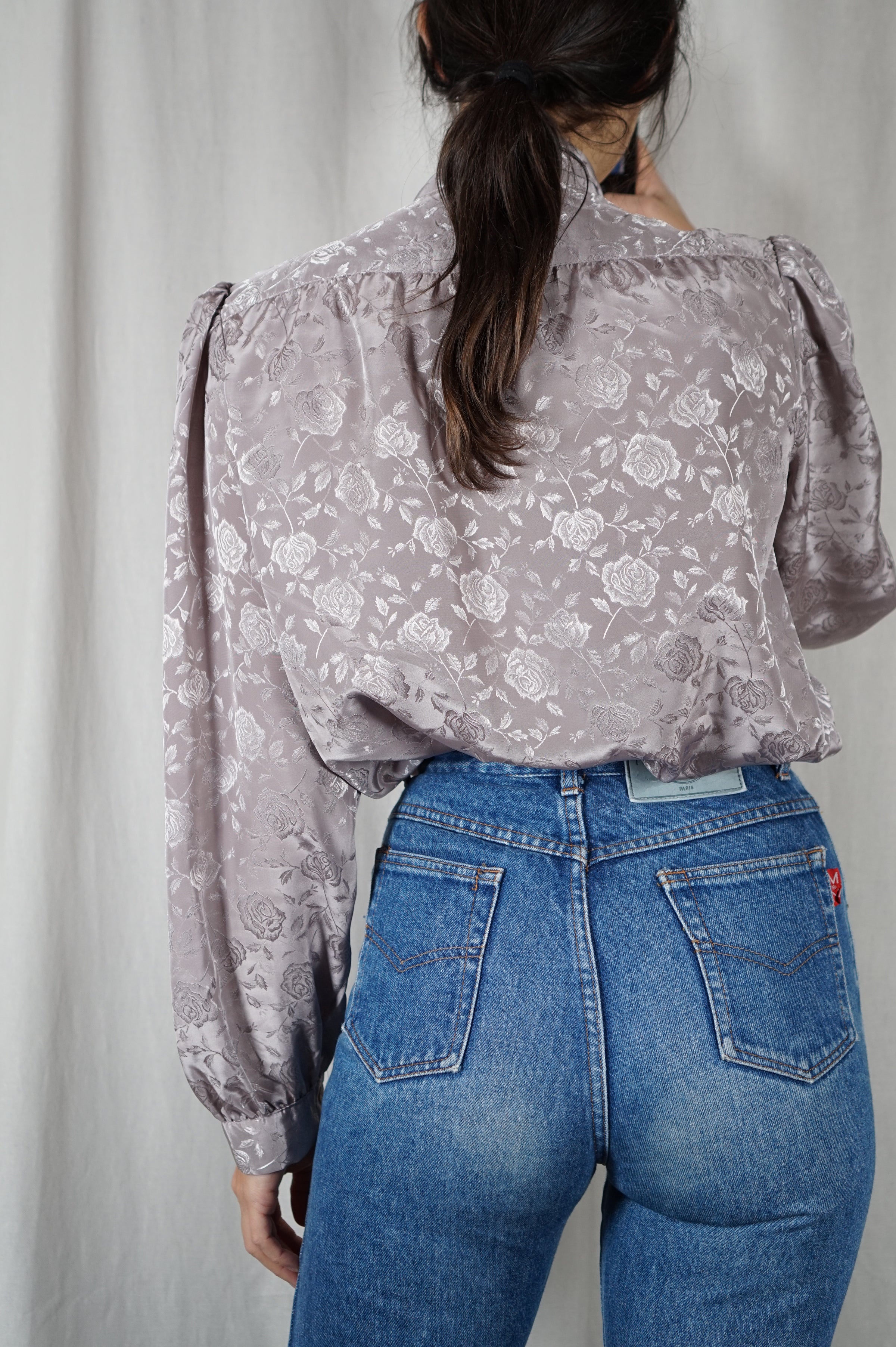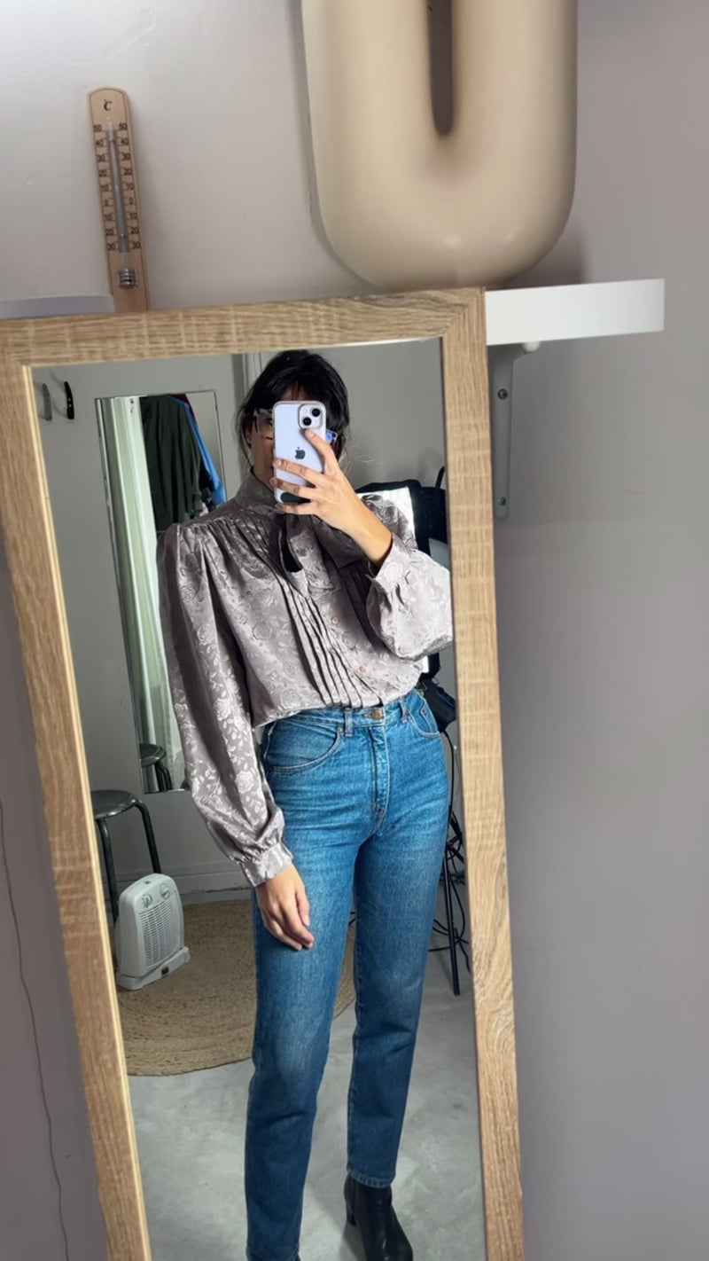 Superbe Chemise Vintage Taupe à col Lavallière - T. 38 à 42