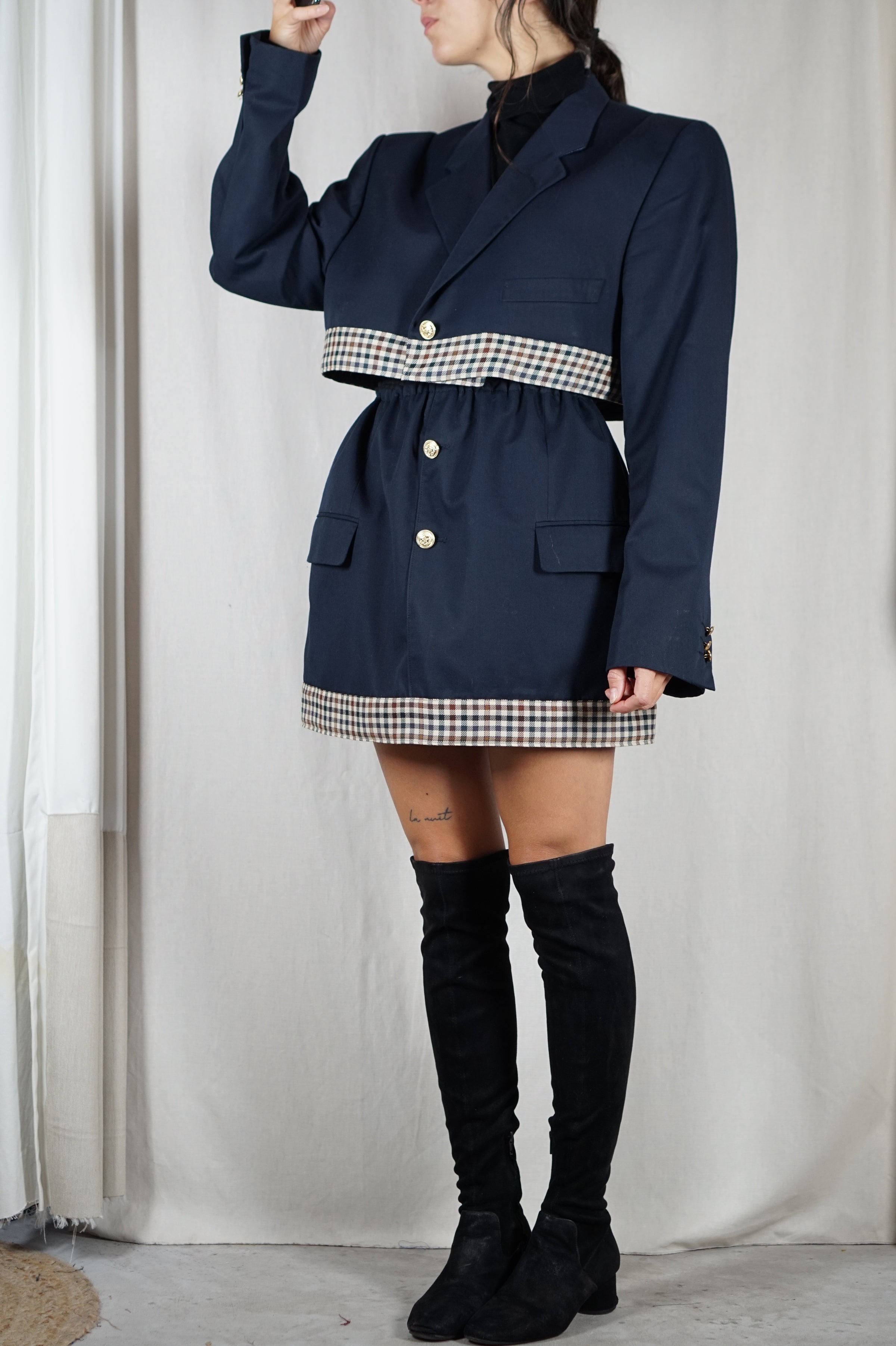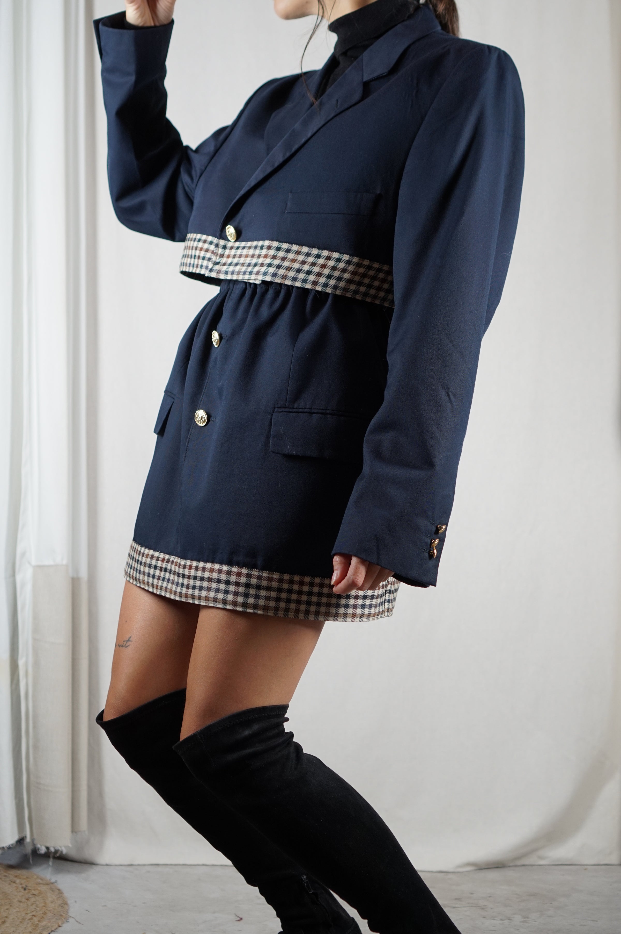 L'Ensemble Anthracite Navy et Tartan est une pièce unique confectionnée à partir d'un Blazer Homme Vintage épais et infroissable d'une très belle qualité et comme neuf (contient de la laine). J'ai intégralement retravaillé la pièce. La veste se fermera avec un bouton pression noir invisible une fois la veste fermée