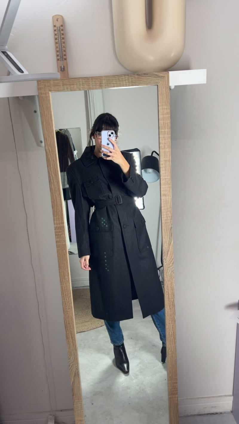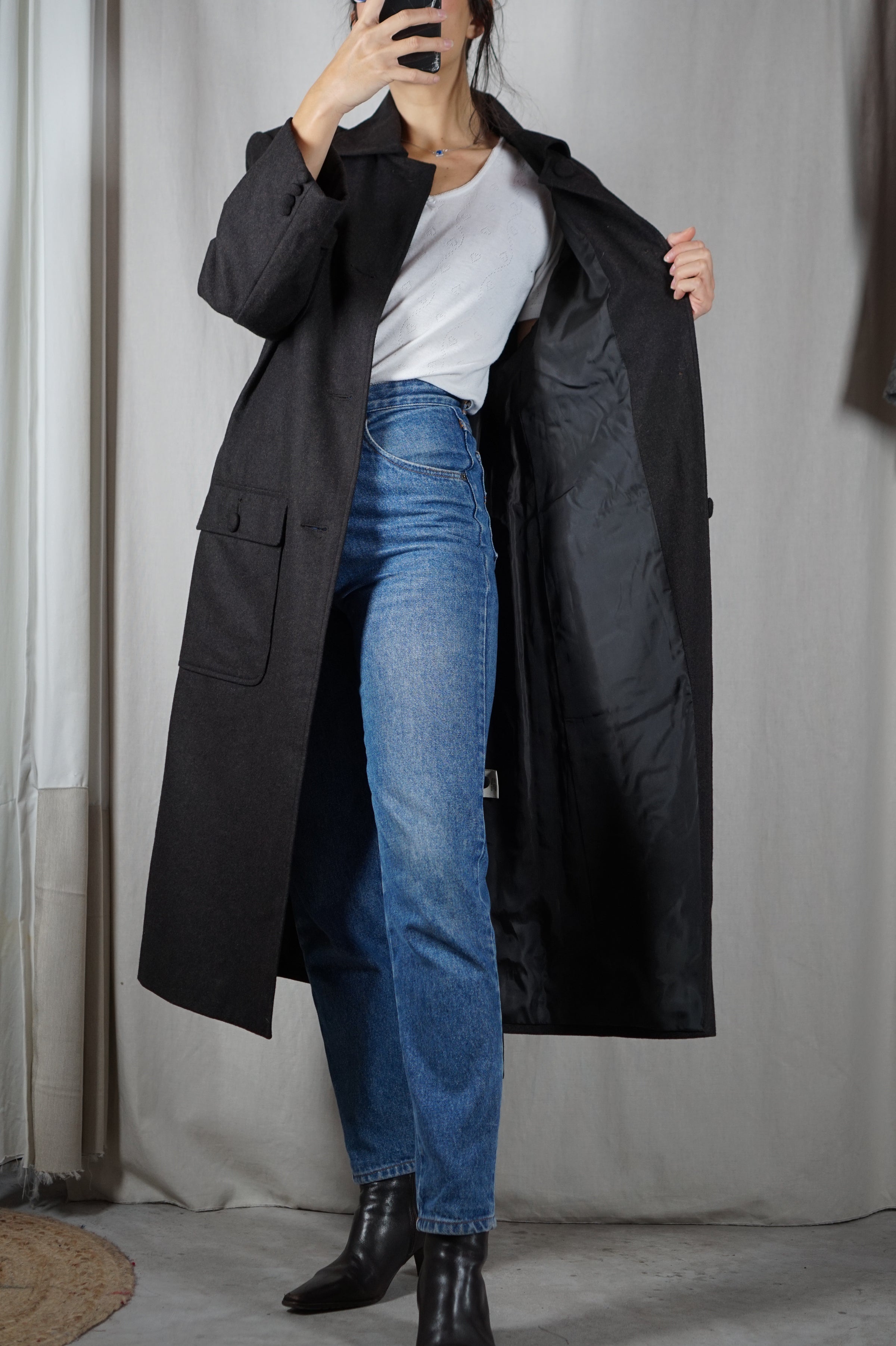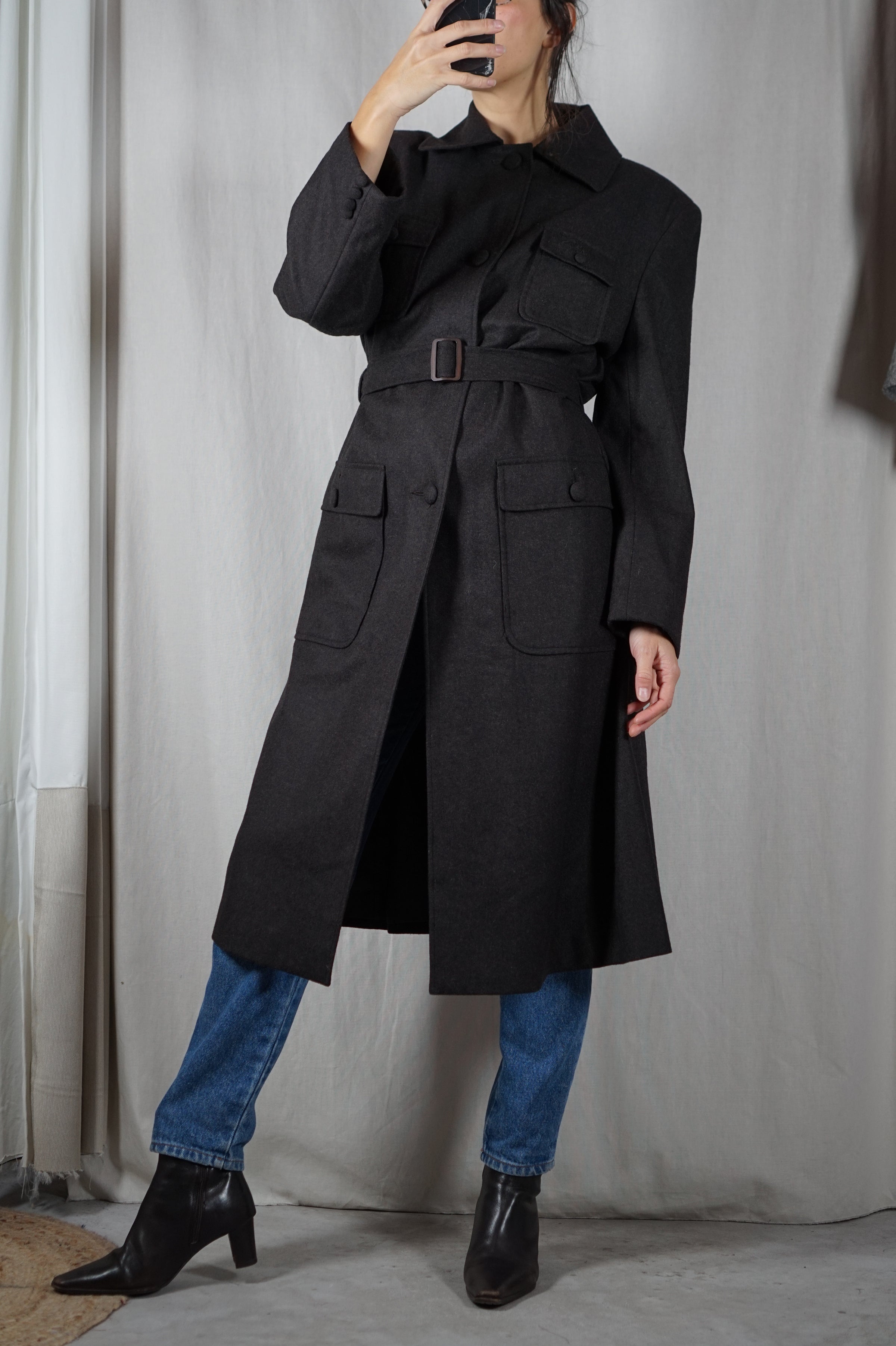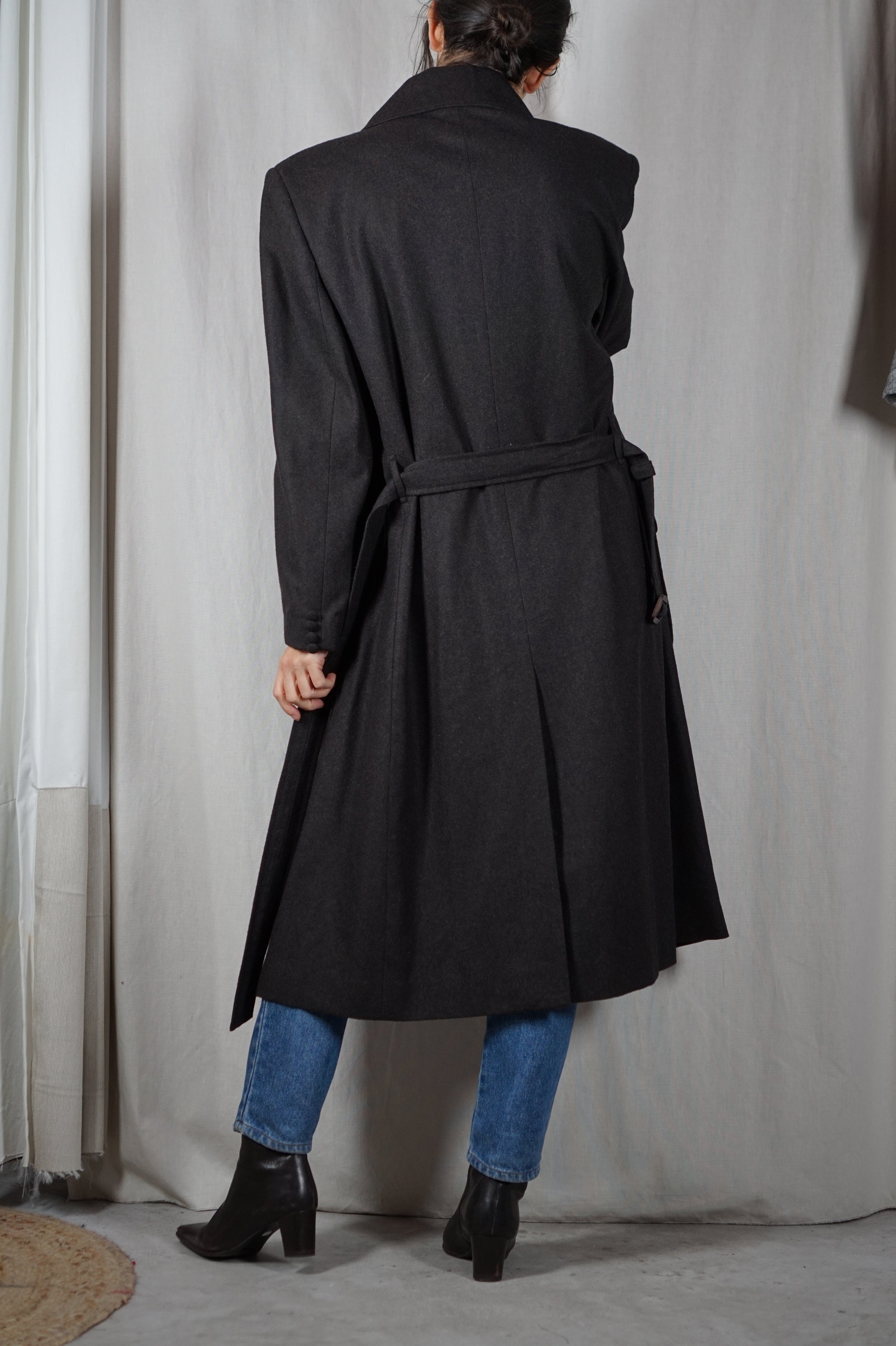 Description : Magnifique Manteau long et sa ceinture - fin mais chaud, intérieur polyester, 55% Laine et reste polyester - pièce coup de coeur, superbe qualité - couleur gris anthracite - épaulettes fines