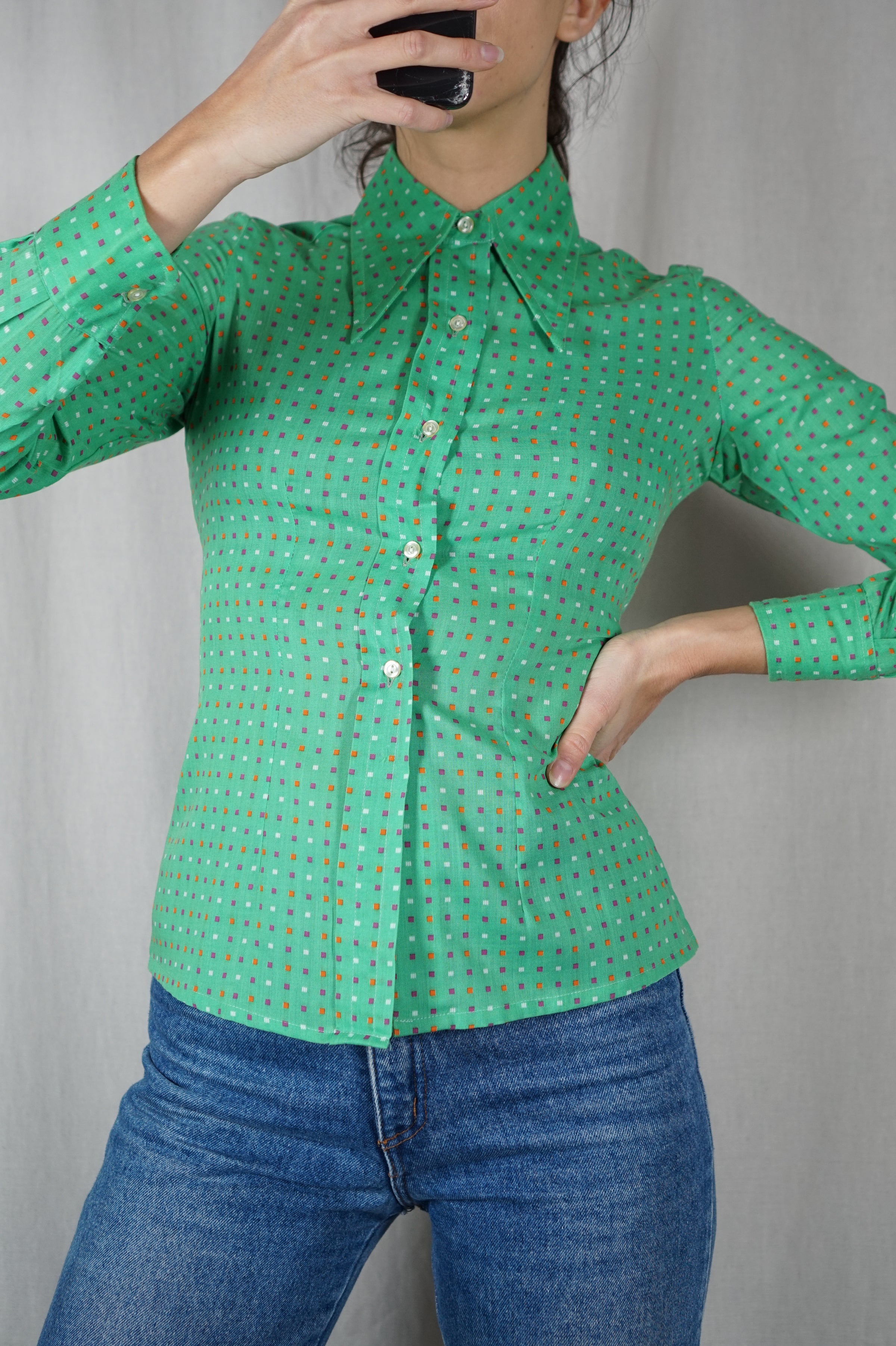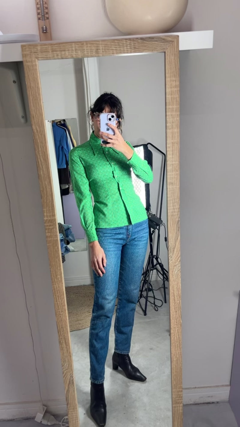 Description : Magnifique Chemisier années 70 - incroyable imprimé - col pelle à tarte - cotyon & polyester mélangé