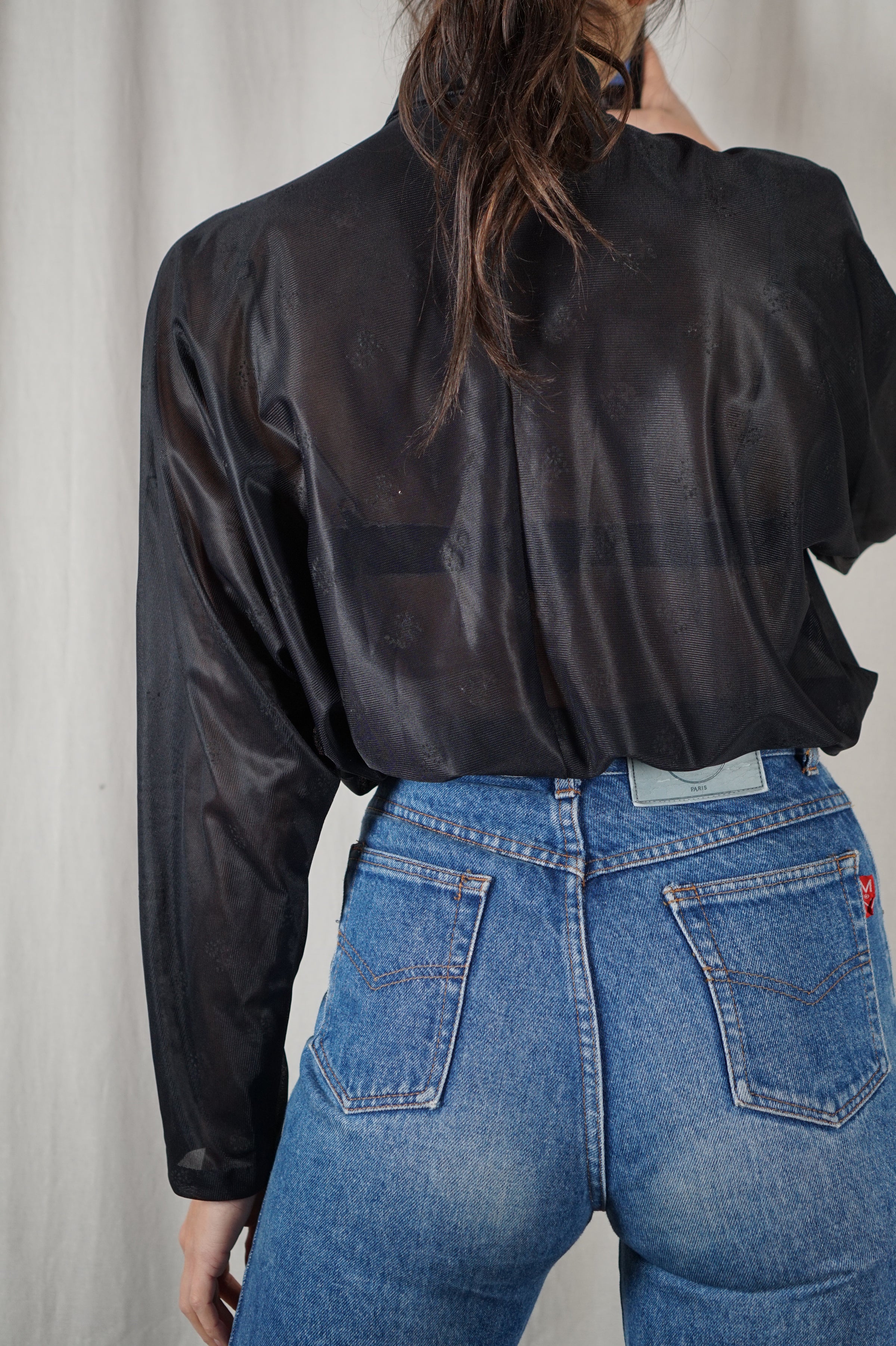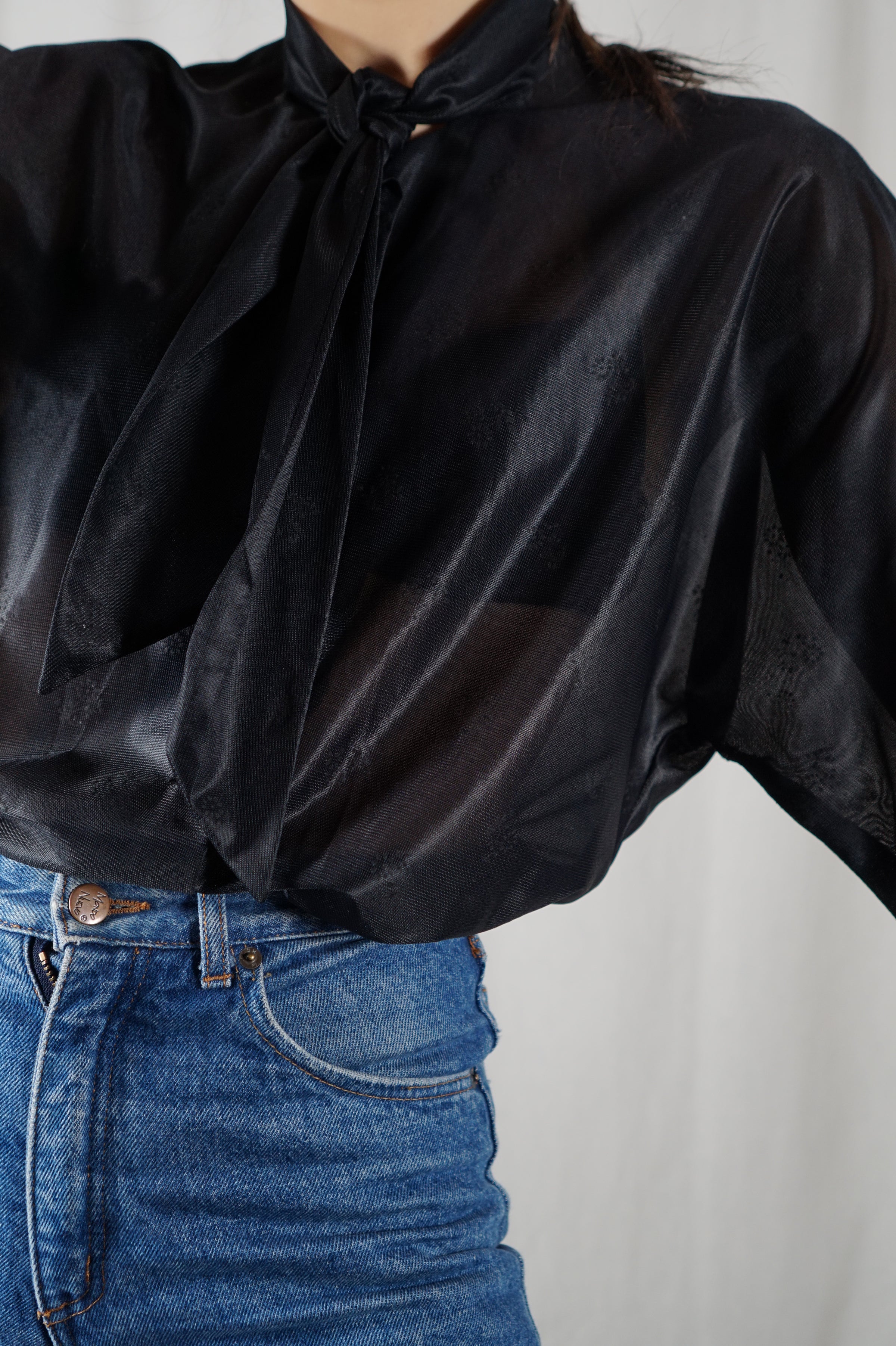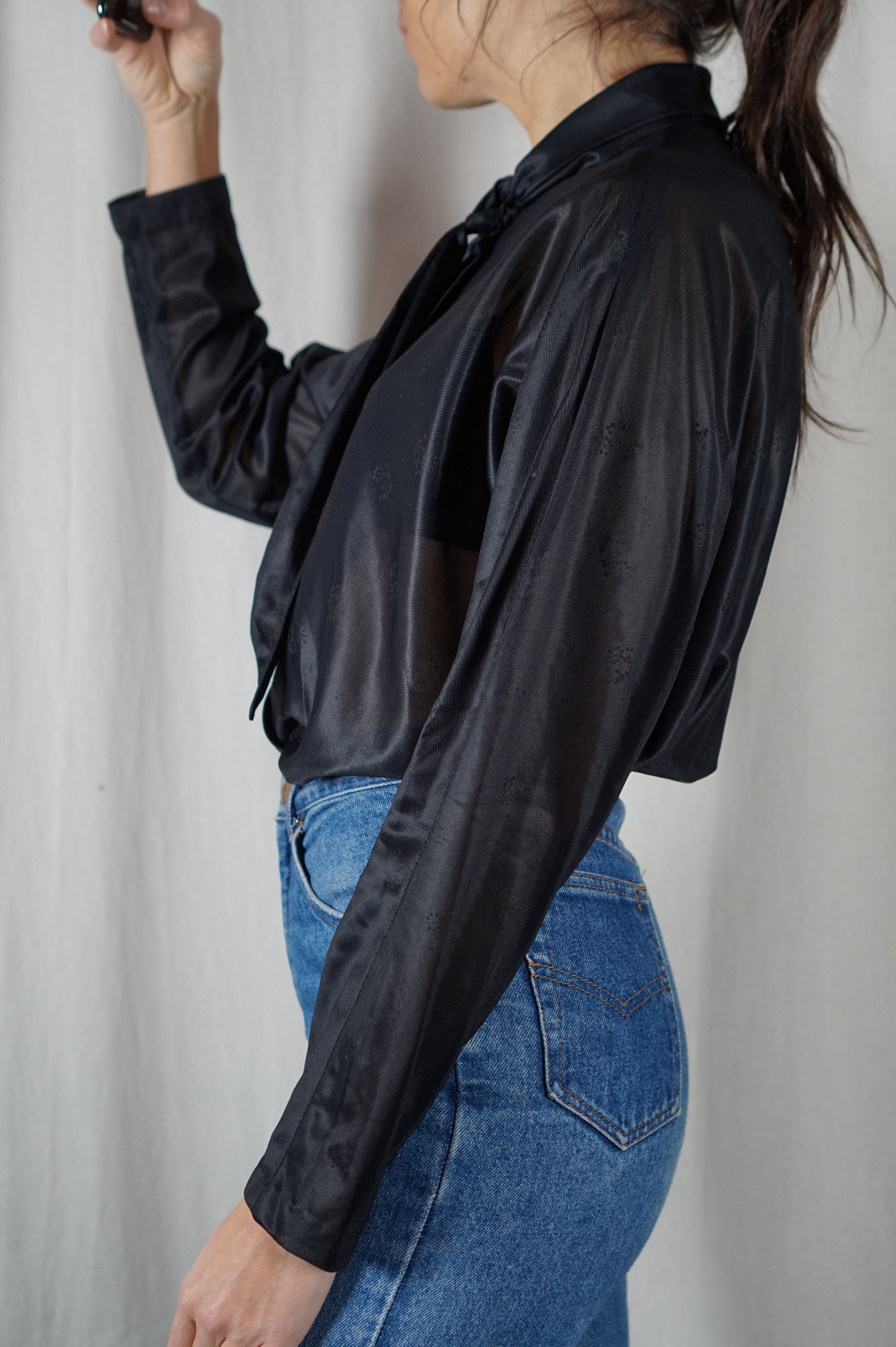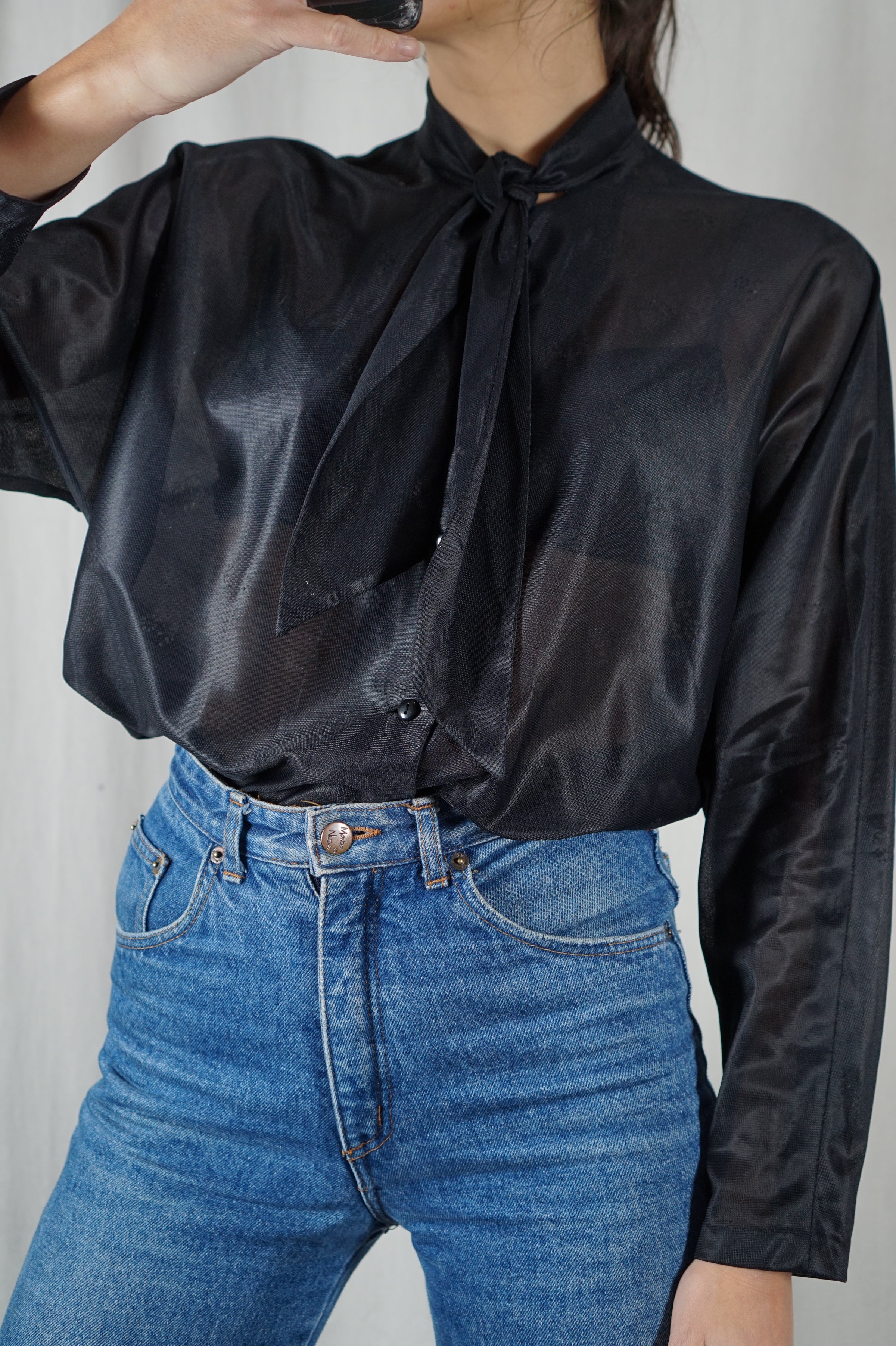 Description : Jolie Chemise vintage à col cravate - noire, légèrement transparente, jolis détails - polyester légèrement extensible si l'on tire dessus