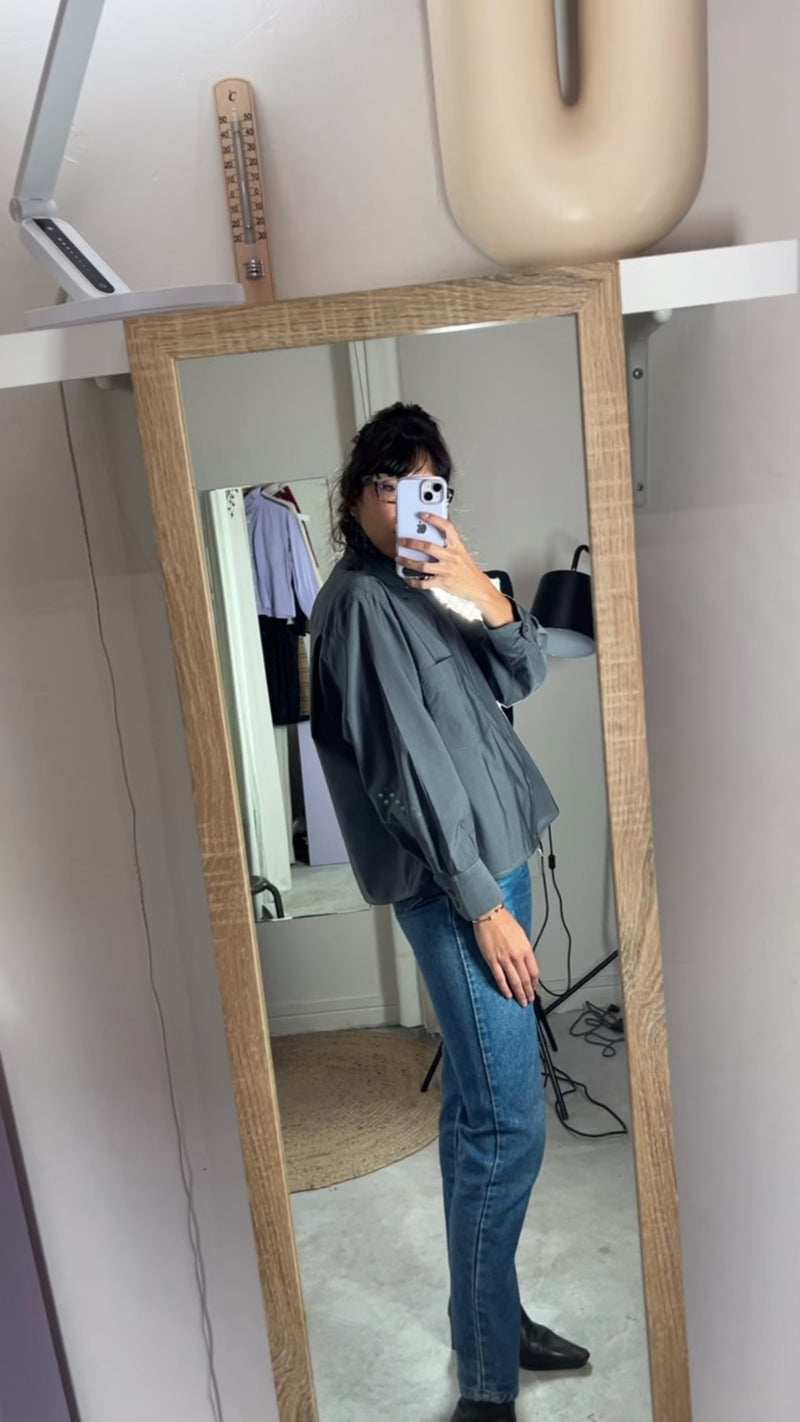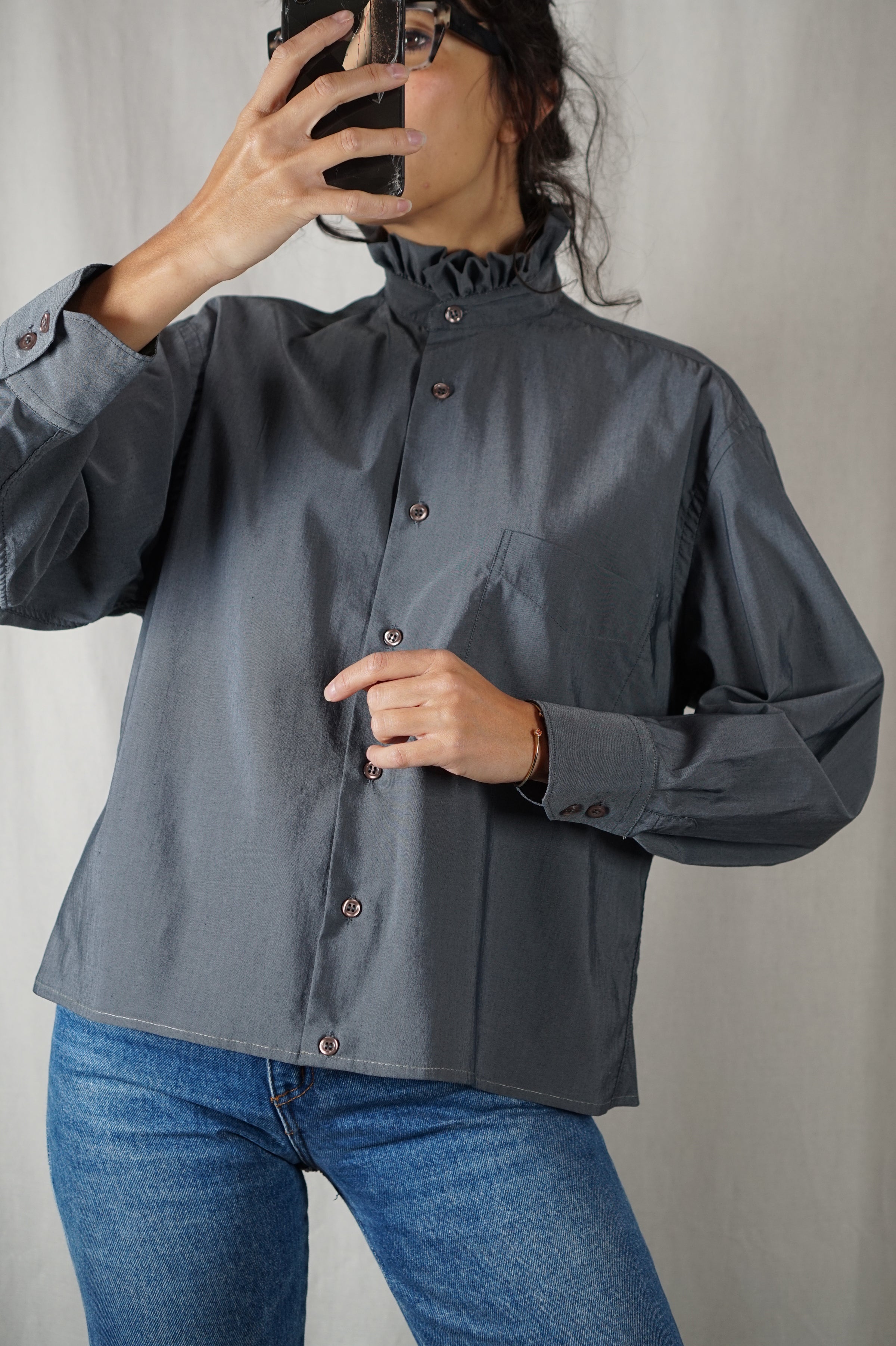 Description : Superbe Chemise Collerette couleur Gris ardoise en coton mélangé (doit contenir un peu de polyester) avec de jolis reflets, cette couleur et matière sont des coups de coeur, retravaillée par mes soins - La pièce d'origine était une belle pièce de très belle qualité - je suis venue raccourcir la chemise afin de recréer une coupe légèrement trapèze, reprendre les manches en remontant le poignet pour raccourcir légèrement les manches (il s'agit à l'origine d'une chemise pour homme, les manches étaient donc plus longues) - j'ai décousu le col et cousu un col froncé que j'ai confectionné avec le bas de chemise pour créer cet effet collerette - La matière et la couleur sont superbes, belle qualité et agréable à porter.