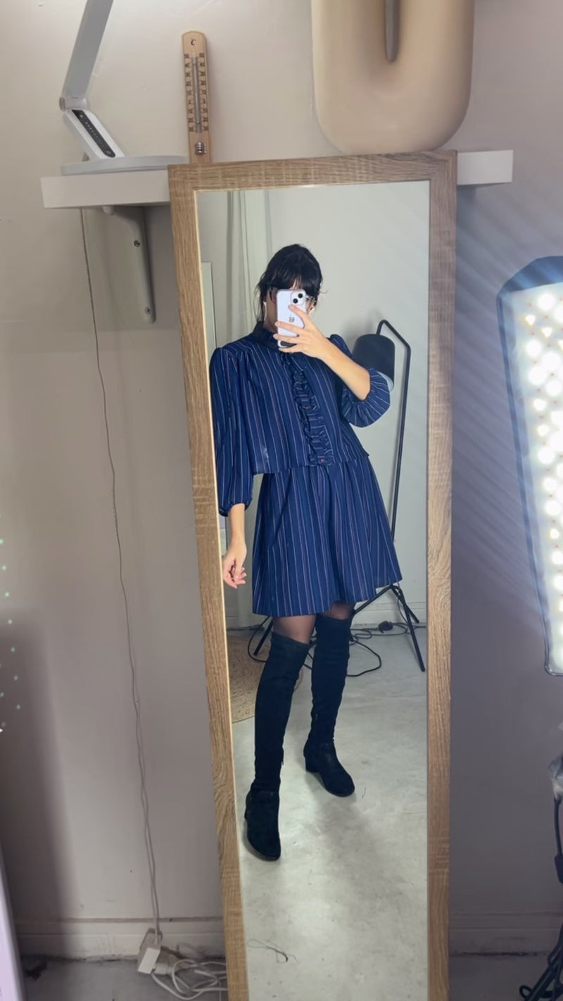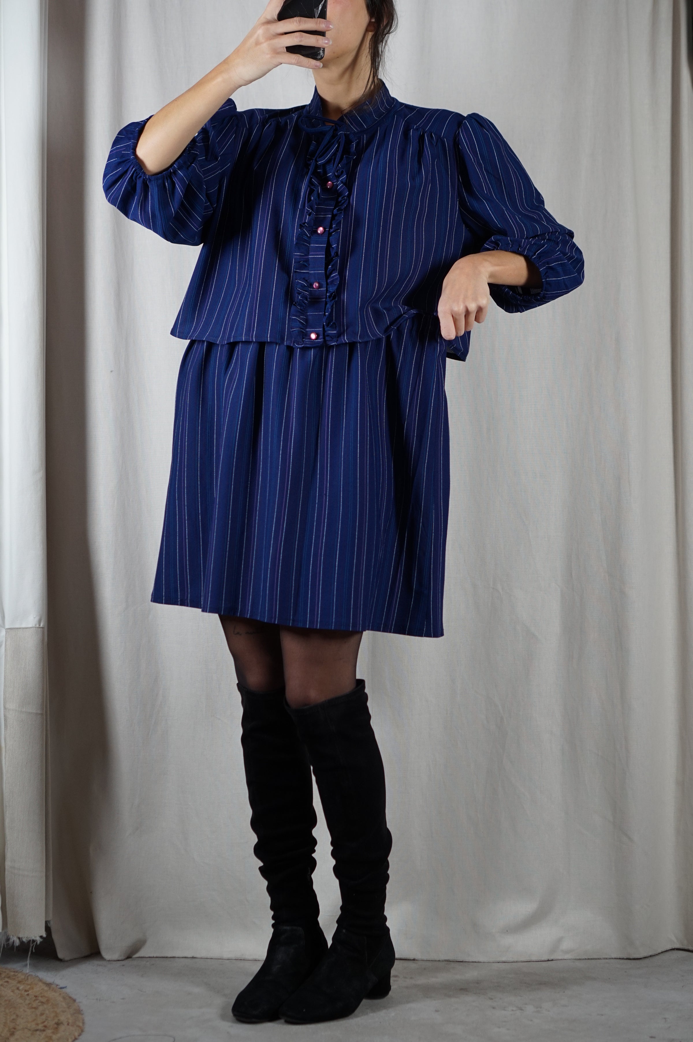 Cet Ensemble Marine rayé à boutons dorés de faut le voir porté est une pièce unique confectionnée à partir d'une Robe longue Vintage de belle qualité en polyester crêpé de très belle qualité. La matière est belle, la pièce d'origine était très peu portée voire jamais. Agréable à porter. Le haut se déboutonne jusqu'en bas si besoin