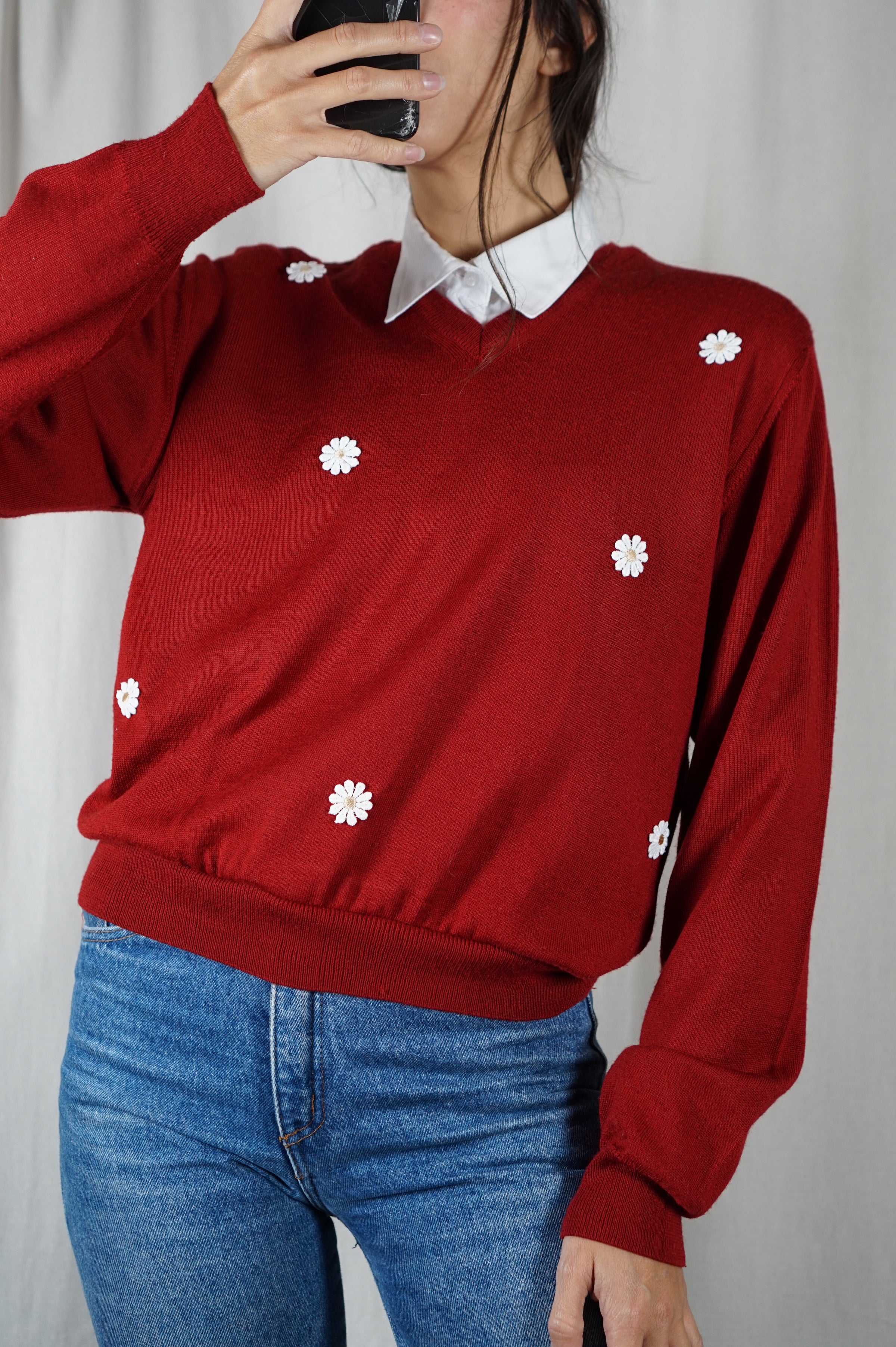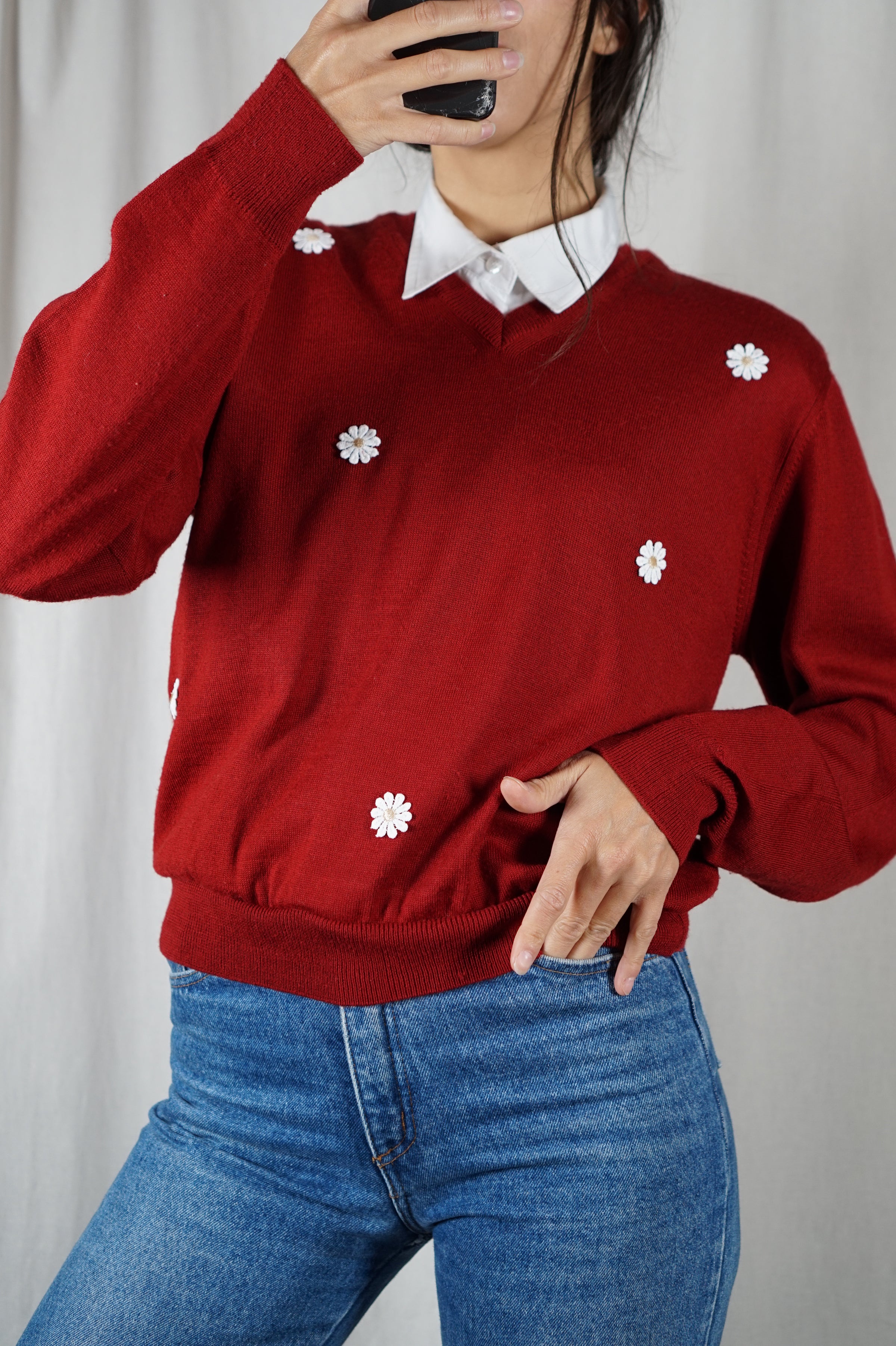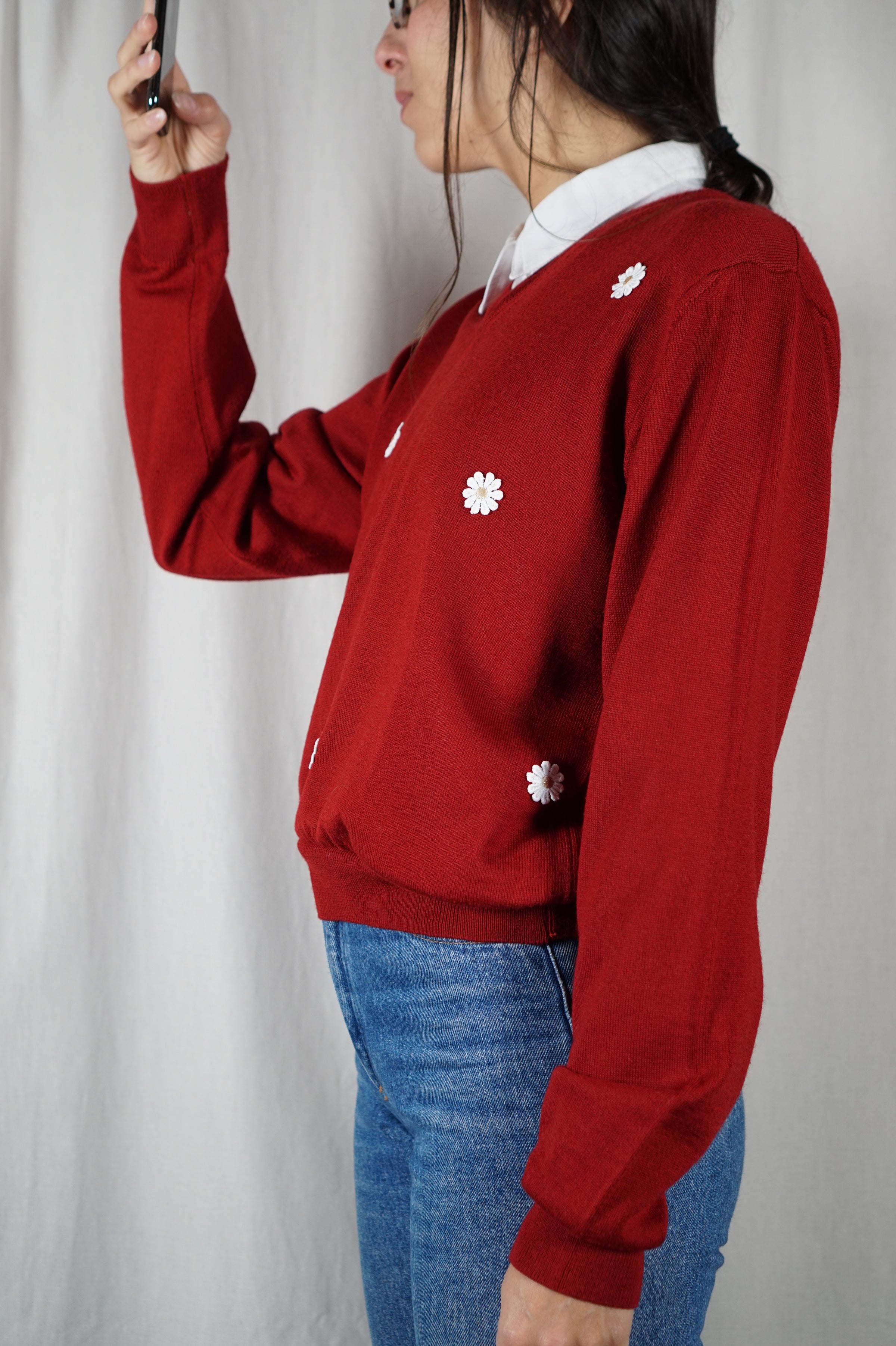 Pull Rouge Carmin Upcyclé Fleuri - Pièce Unique faut le voir porté - Laine - T. 36 à petit 40