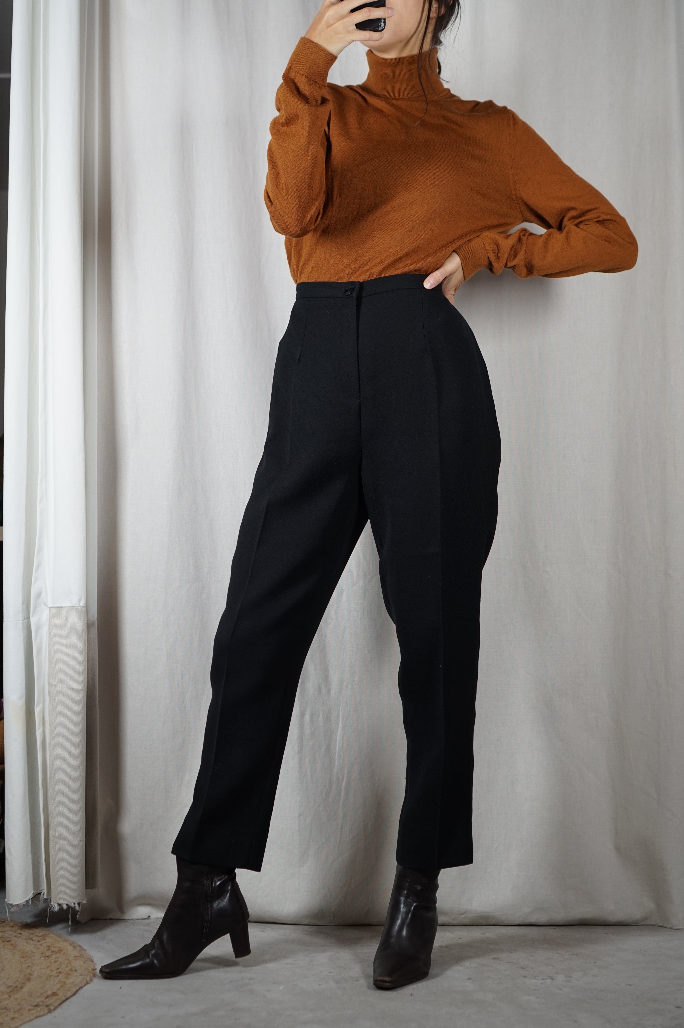 Description : Superbe Pantalon Vintage coupe carotte, noir en laine et polyester - superbe tombé - matière agréable à porter - fluide et assez épais - bien opaque