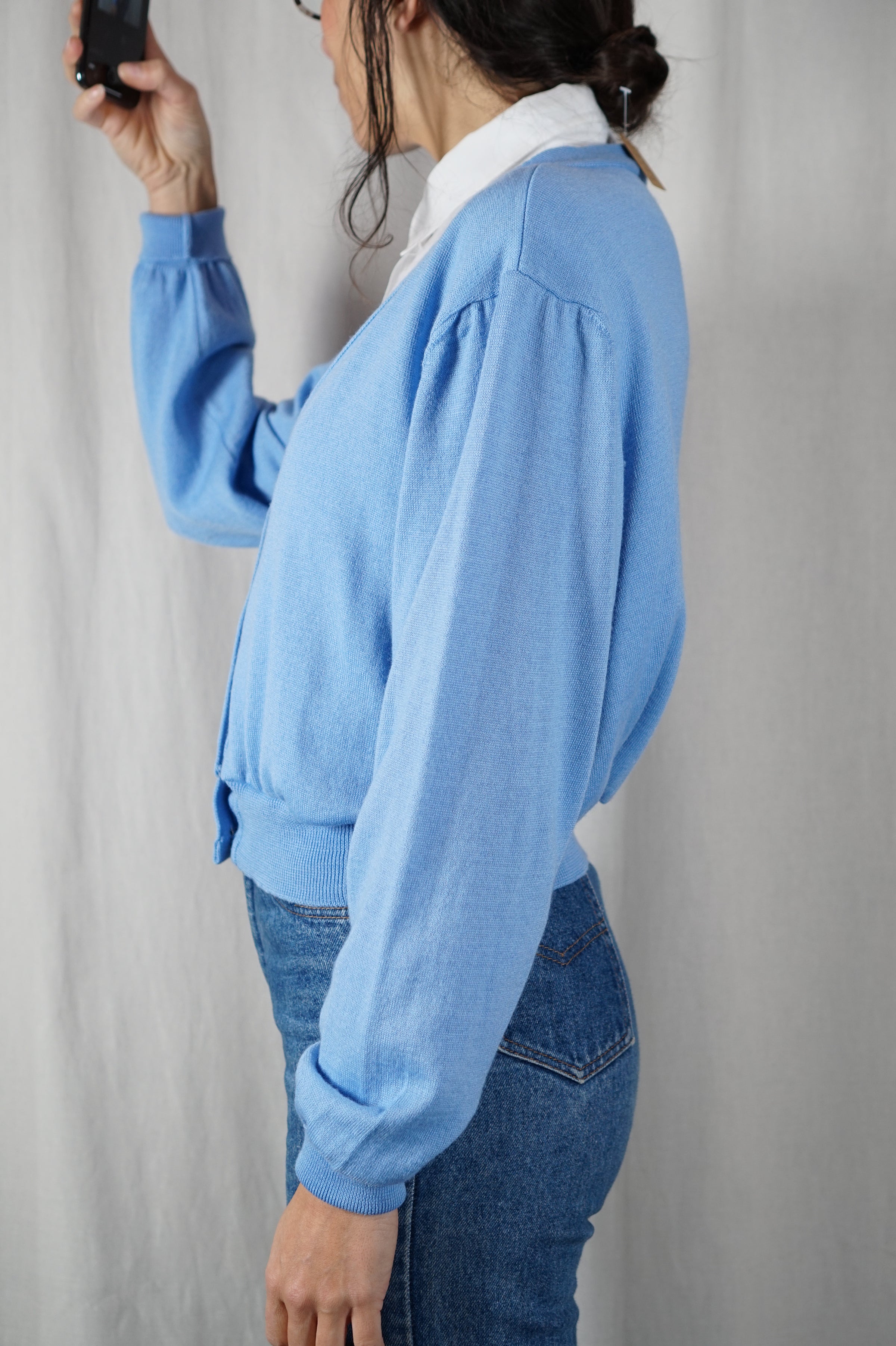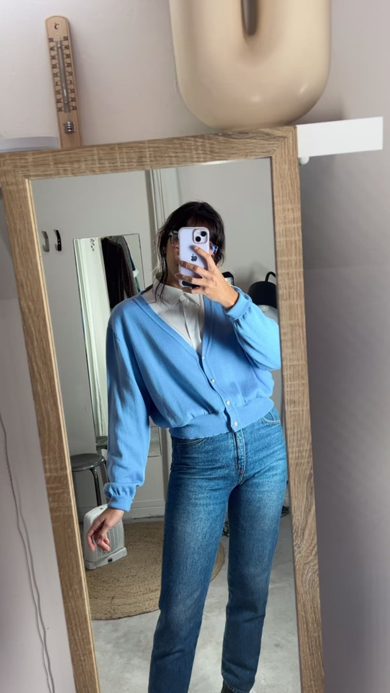 Cardigan Bleu bébé upcyclé - Pièce Unique faut le voir porté - Laine mélangée - T. 36 à 42 (lire descr)