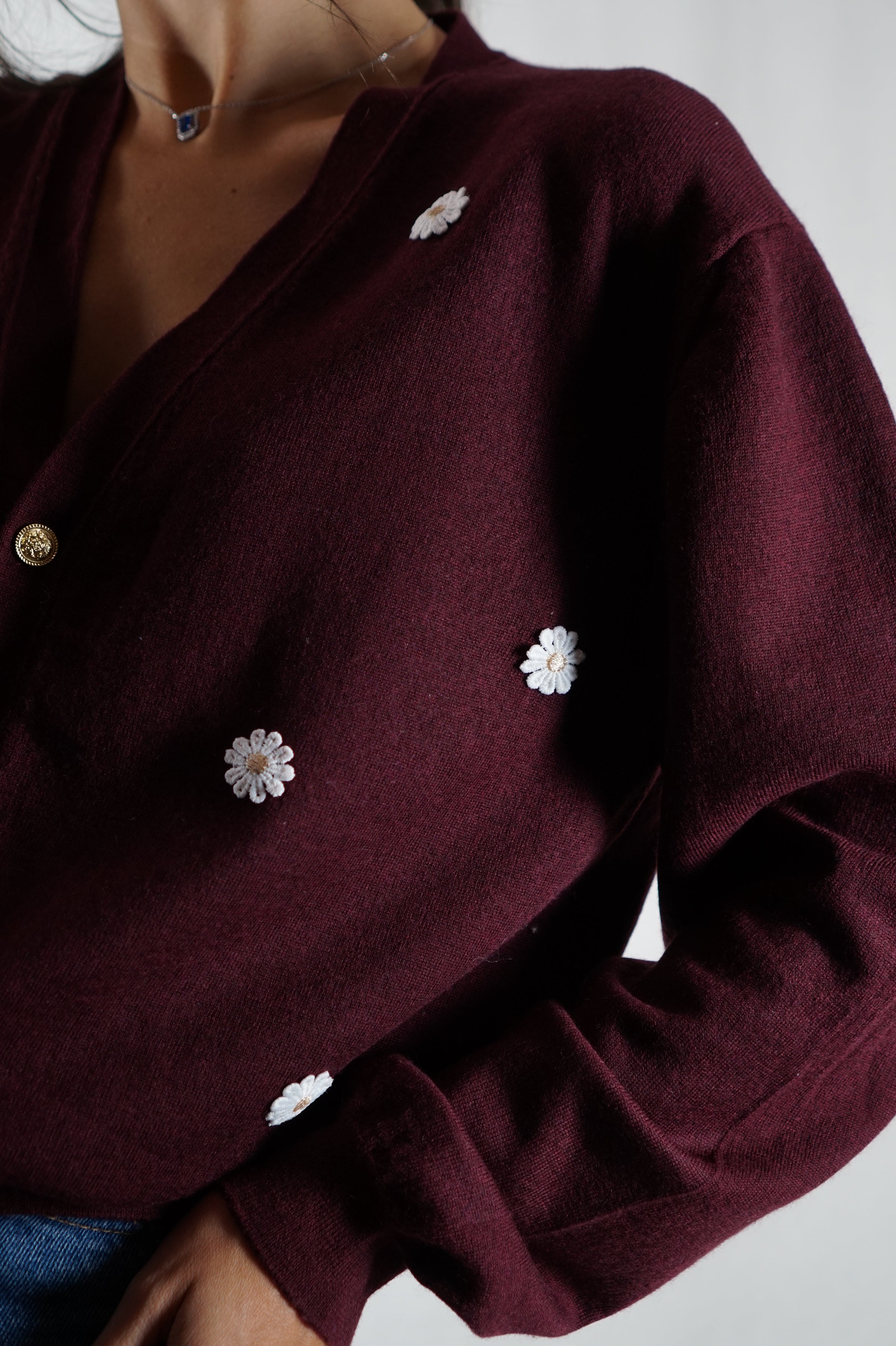 PIÈCE UNIQUE - Superbe Cardigan de la marque Monoprix (très belle qualité), fabrication italienne, Cardigan neuf, 100% Laine initialement pour homme, entièrement retravaillé par mes soins - fin mais chaud - Je suis venue raccourcir le cardigan qui était trop long en reprenant le bas (surjeteuse), j'ai également remplacé et cousu de nouveaux boutons et j'ai cousu chaque marguerite à la main en doublant le fil, ceci pour lui donner un look + moderne et unique - on pourra également le porter avec une chemise en dessous - la matière est extensible - superbe couleur encore plus jolie en vrai. Les manches pourront être retroussées si besoin tout en restant jolies