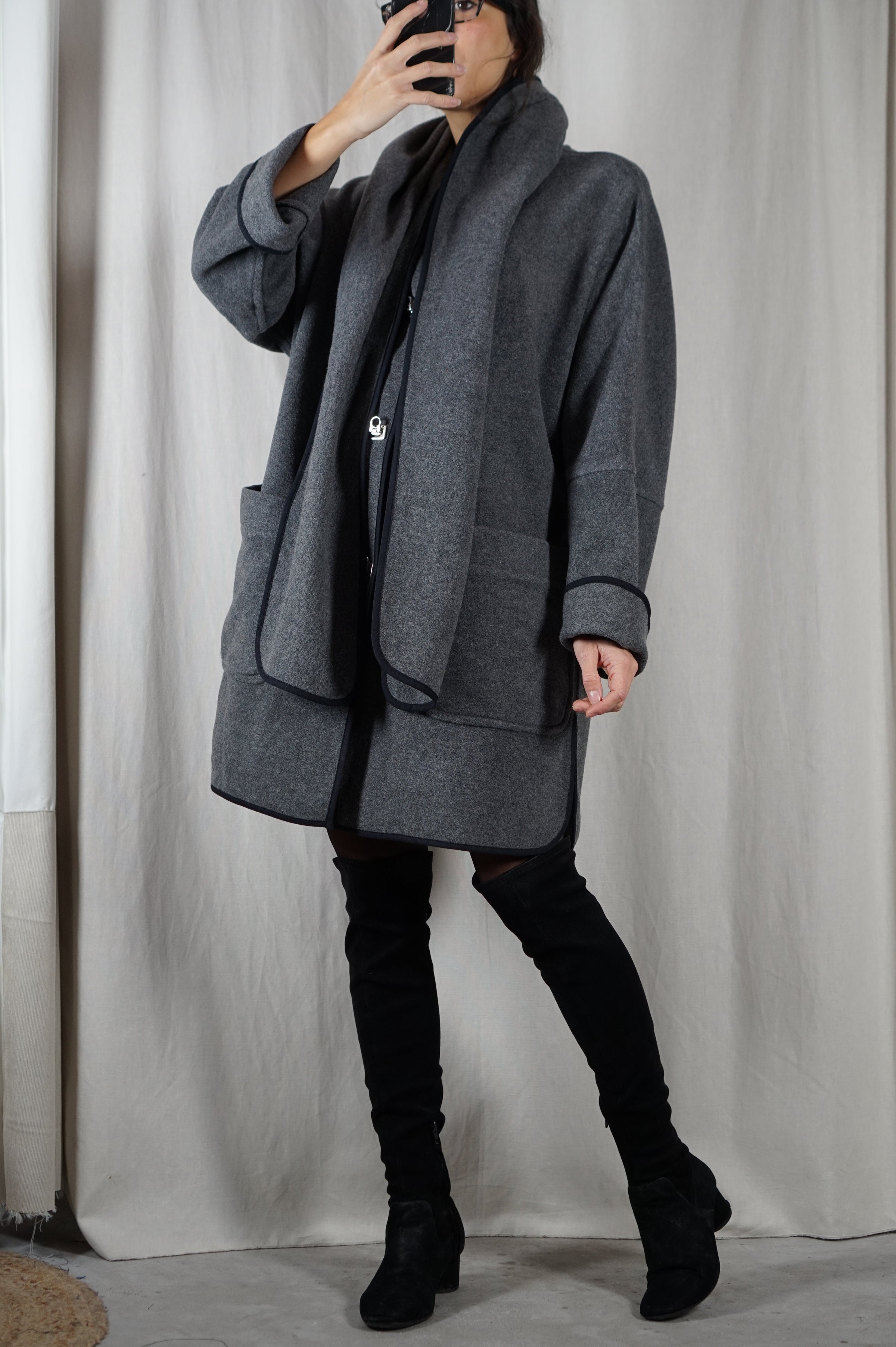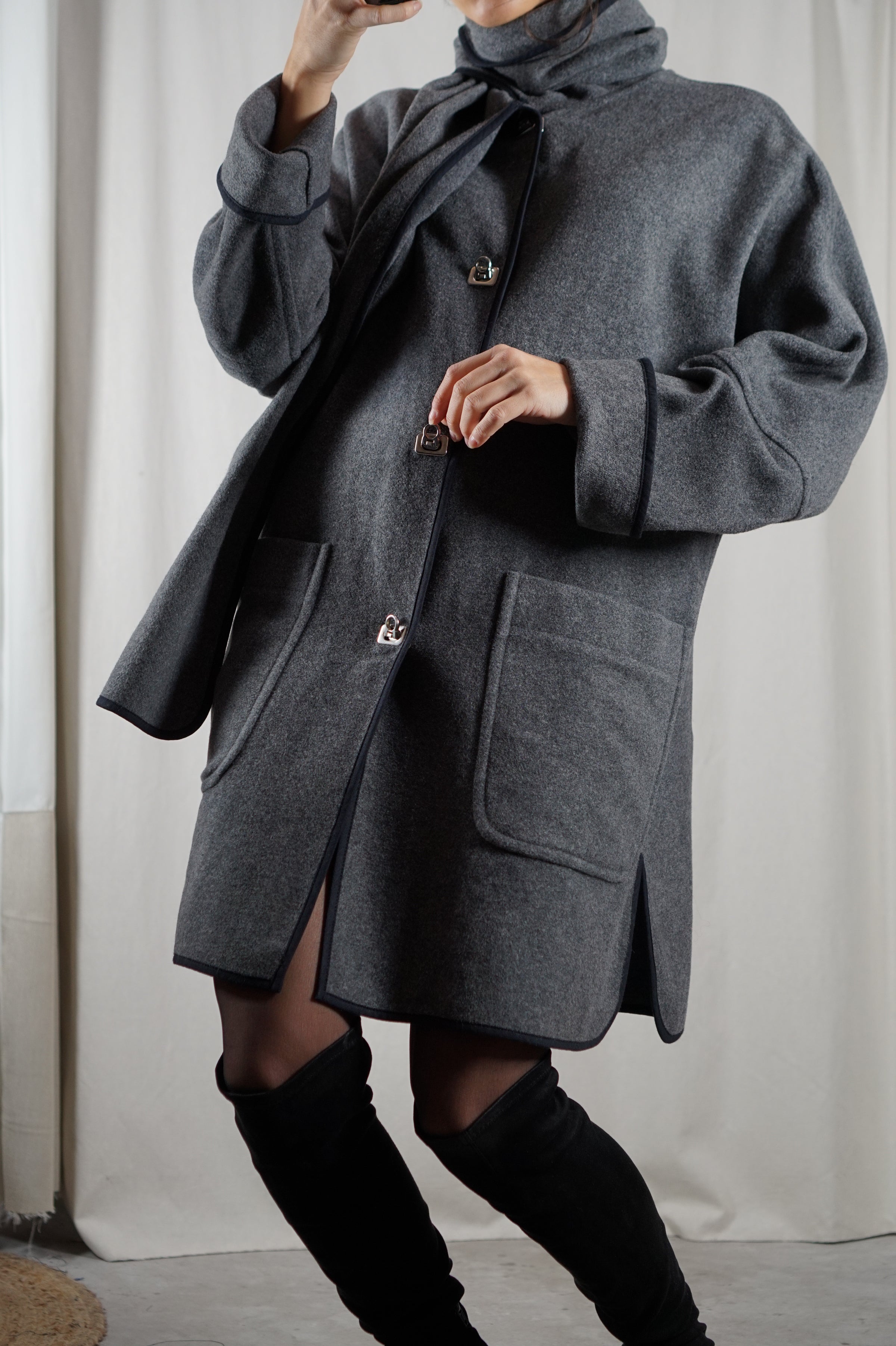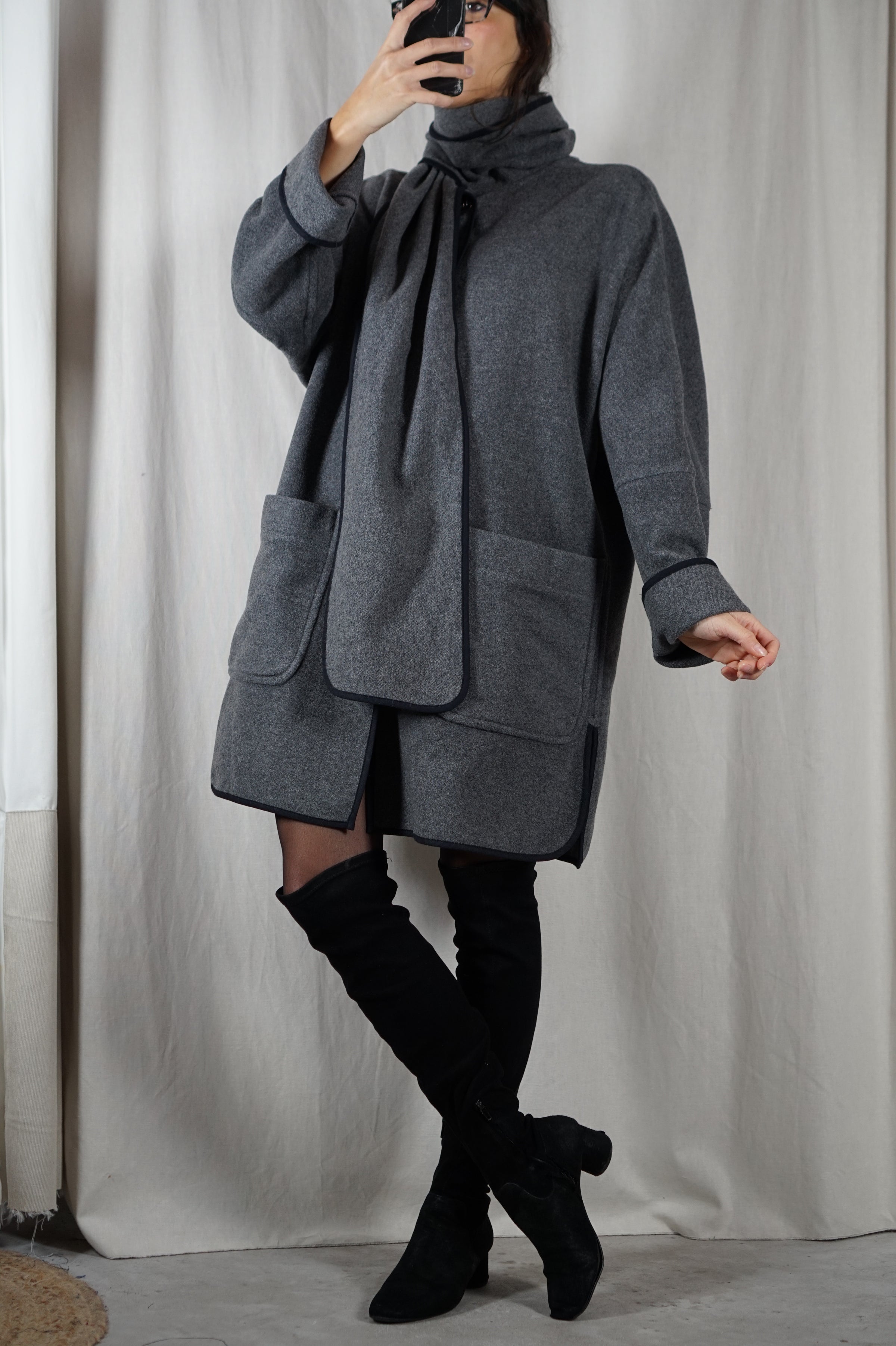 Description : Incroyable manteau Vintage en laine fine (mais chaude) - Pièce RARE - Se portera écharpe lâchée ou enroulée autour du coup - énorme coup de coeur! 80% Pure laine vierge et reste polyamide - la pièce a été lavée et repassée au préalable - se portera oversize - idéale fin d'hiver