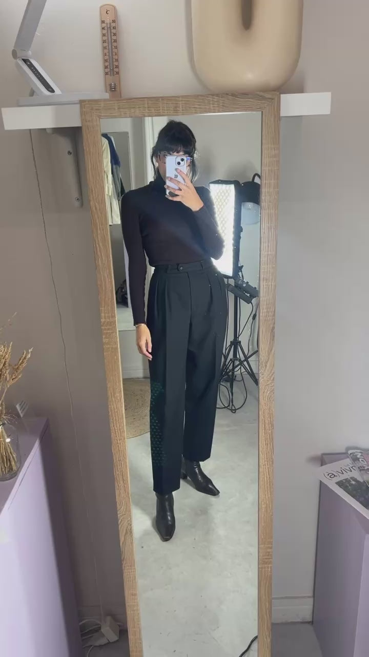 Description   : Incroyable Pantalon vintage à pinces bien noir - laine & polyester - je ne trouve pas qu'il pique - énorme coupe de coeur, la qualité est incroyable - bien opaque et assez épais