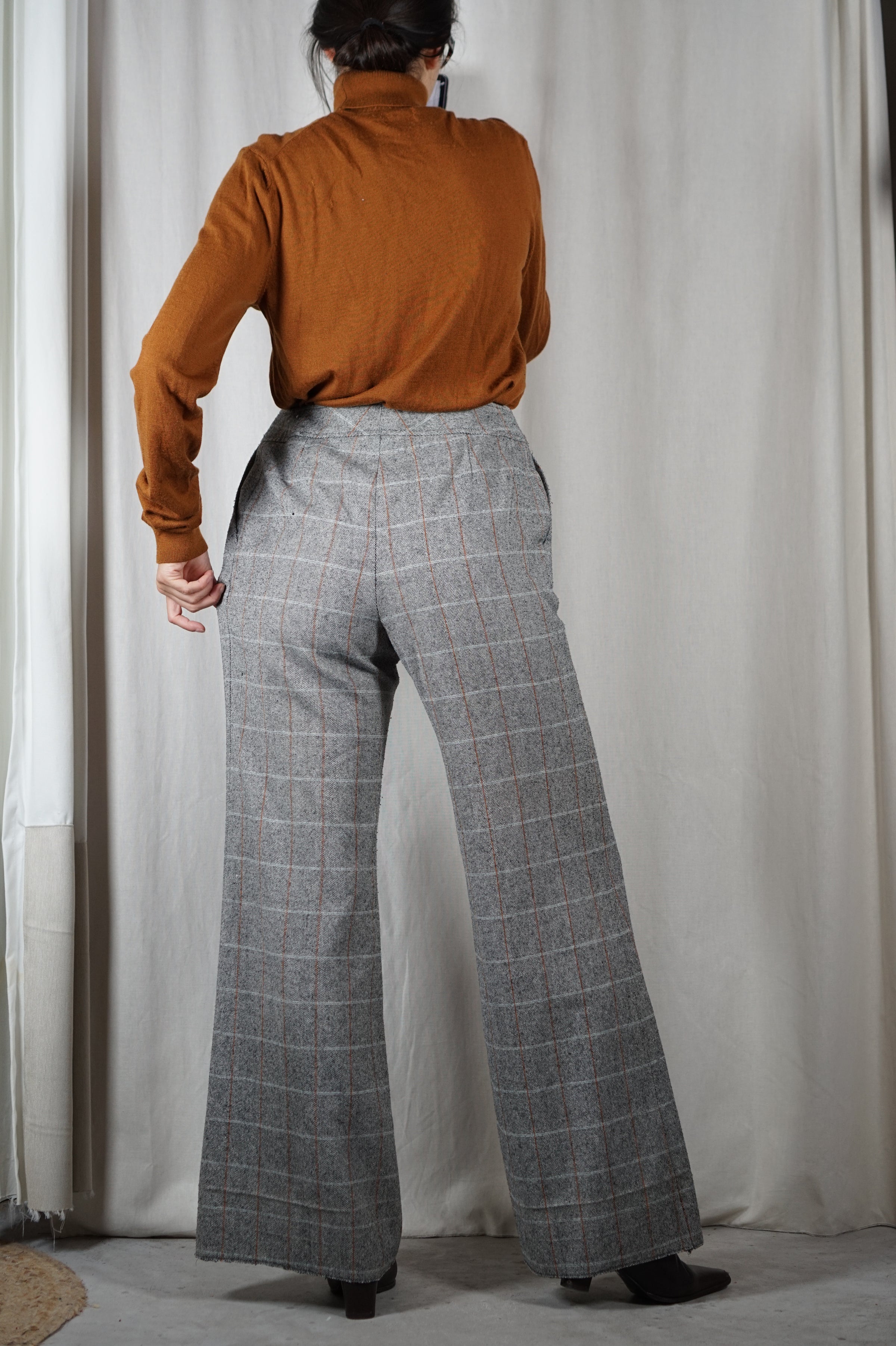 Description : Superbe Pantalon Vintage gris tartan coupe flare - très belle pièce - magnifique tombé - taille haute - 2 boutons pression - ne pique pas - contient de la laine (matière peu épaisse mais opaque)